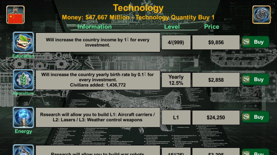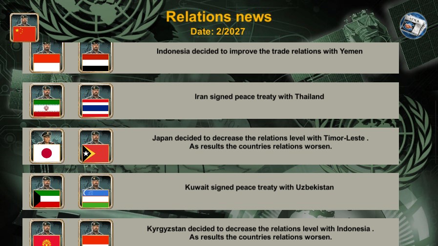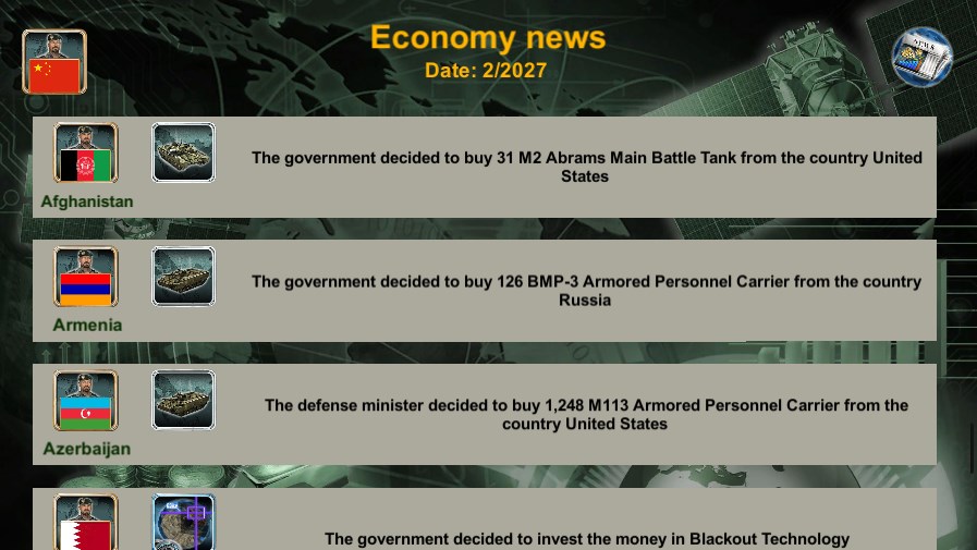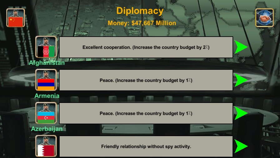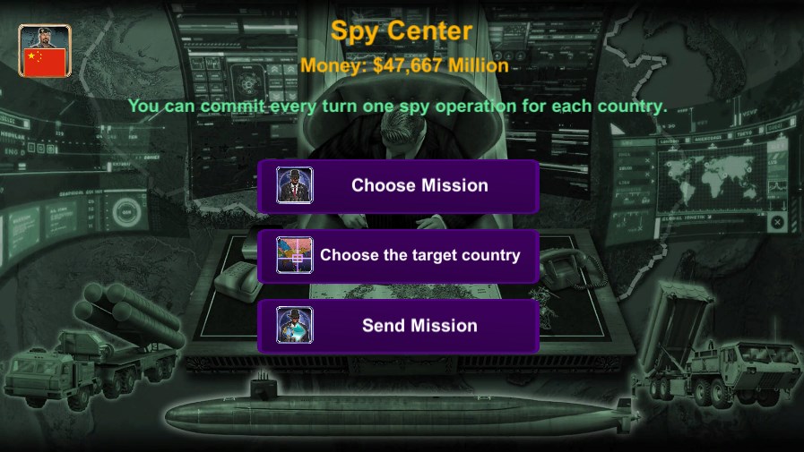Weapons Suppliers from around the world, a Spy Center, a War Room, Diplomats, United Nations, an Economy system, Technology, World News Distribution (Economy, Relations, Spy and War) and very advanced Artificial Intelligence.