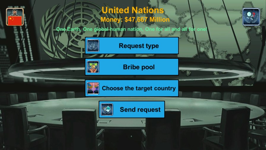 Single Player you as leader vs 49 other countriesOnline multiplayer up to 8 playersReal data from worldwide sources: economy, relations, arms...Normal, Hard, Very Hard, Impossible, Custom sandbox mode, risk mode, zombie\'s mode and unlimited money option.Countless spy, war, diplomacy, technologies, United Nations actions and optionsLocal play up to 8 playersGame supports more than 35 languages
