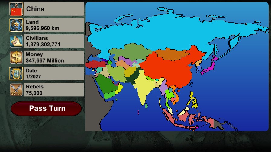 Select your country you wish to lead (50 countries available!) and play against the smart AI enemies.