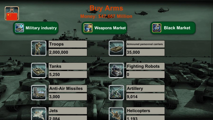Mercenaries, Armored Personnel Carriers (APCs), Tanks, Artillery, Anti-Air Missiles, Helicopters, Fighter Jets, Ships, Submarines, Fighting Robots, Unmanned Aerial Vehicles (UAVs), Aircraft Carriers and Ballistic missiles.