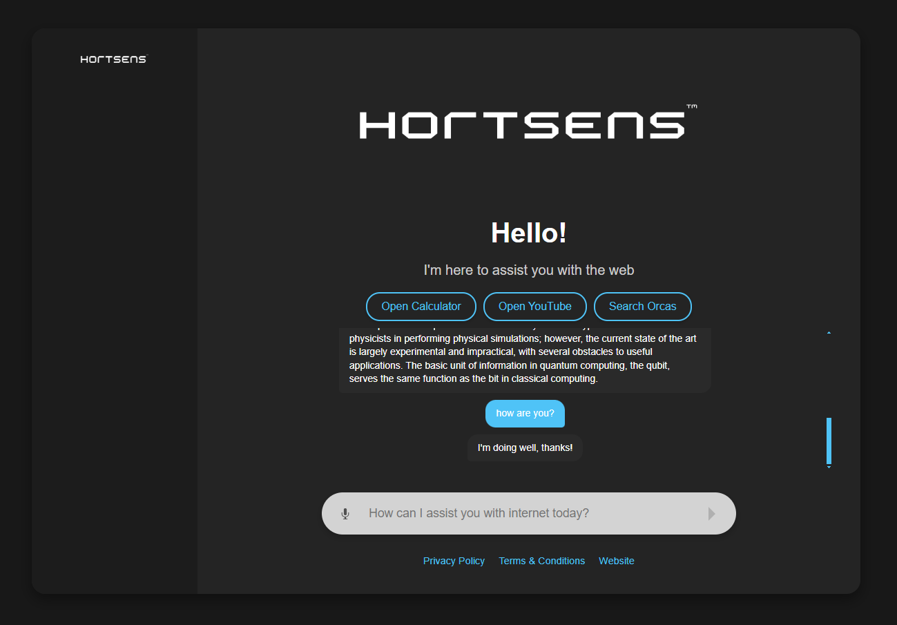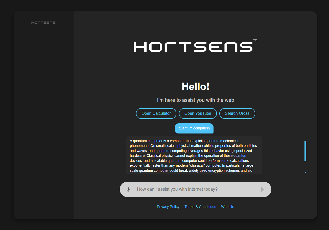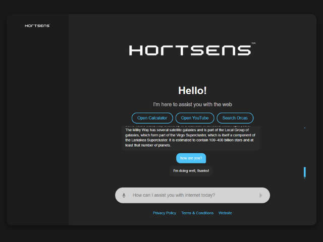 Welcome to HortSens AI Assistant, your new digital companion designed to enhance your productivity and provide seamless web navigation. This innovative assistant is packed with powerful features, all wrapped in a sleek and modern interface.