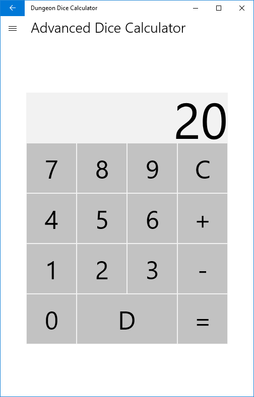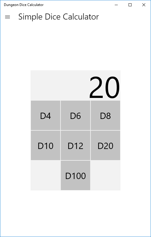 A calculator to roll role playing game dice. Offers a simple calculator to roll a single d4, d6, d8, d10, d12, d20, and d100 as well as an advanced calculator to roll multiple dice of the same type. This was created as a college class project.