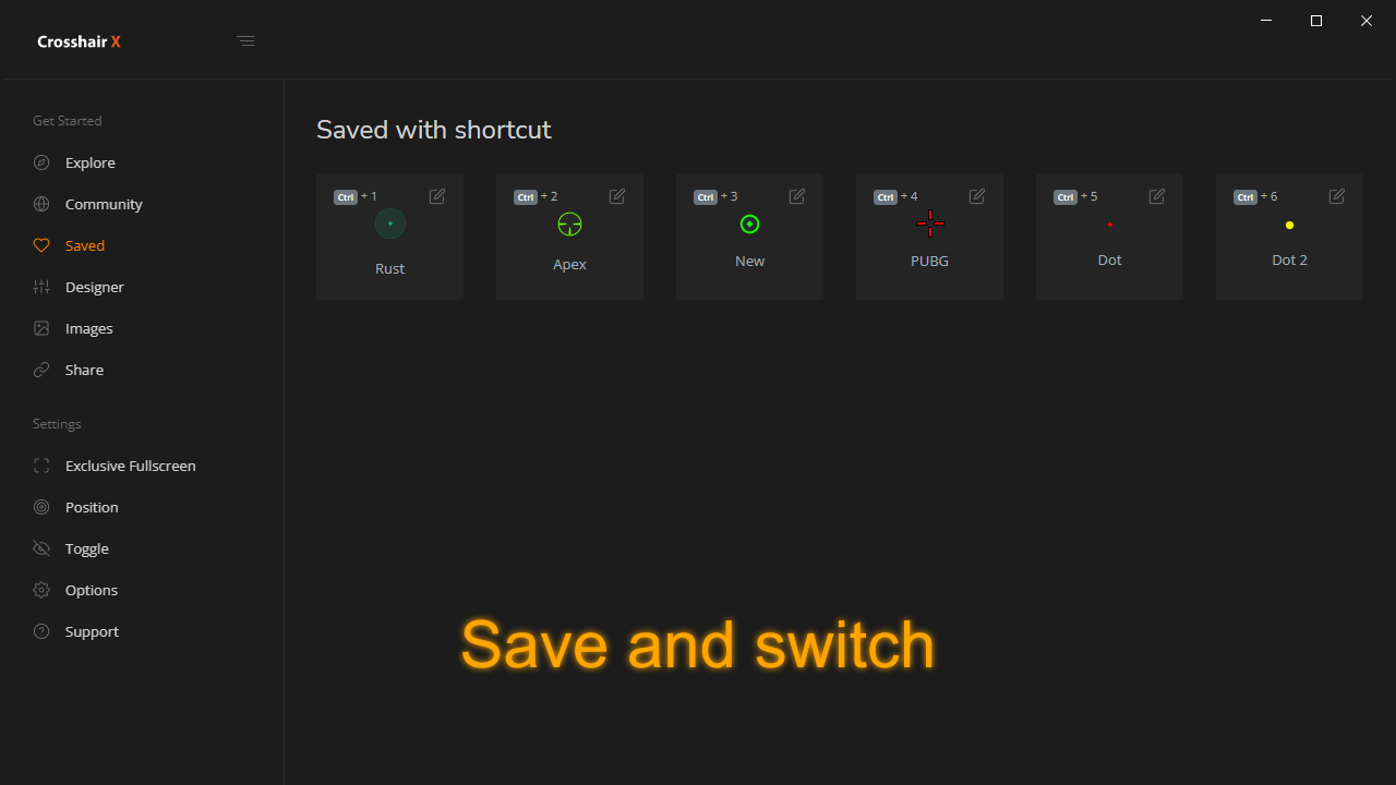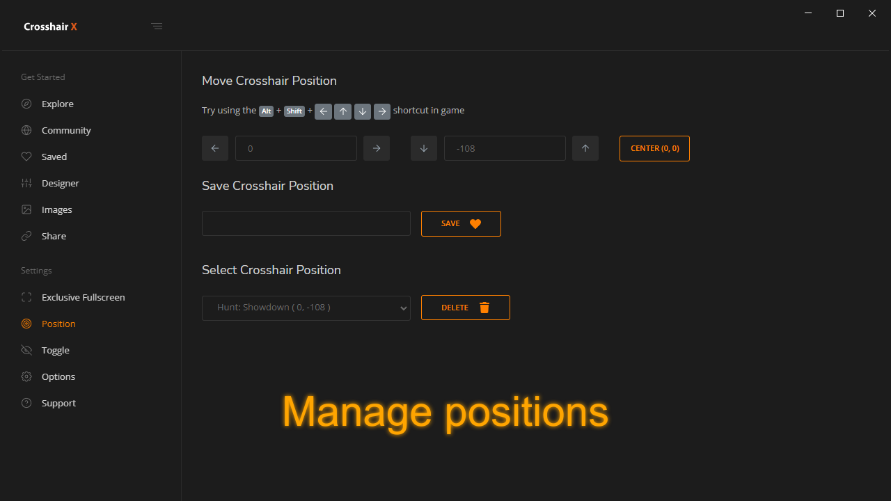 • Positions: Display your crosshair on any monitor and manage saved positions for different games