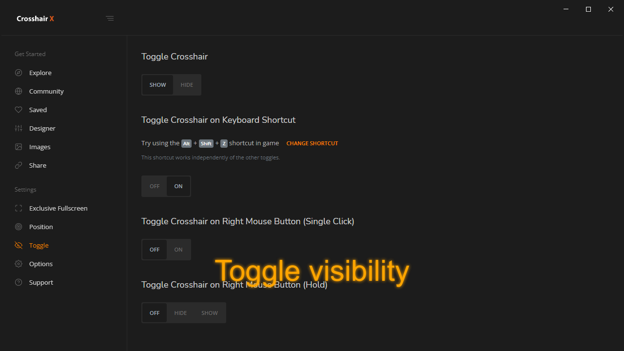 • Toggle: Toggle the visibility of your crosshair with many different mouse states and keyboard shortcuts