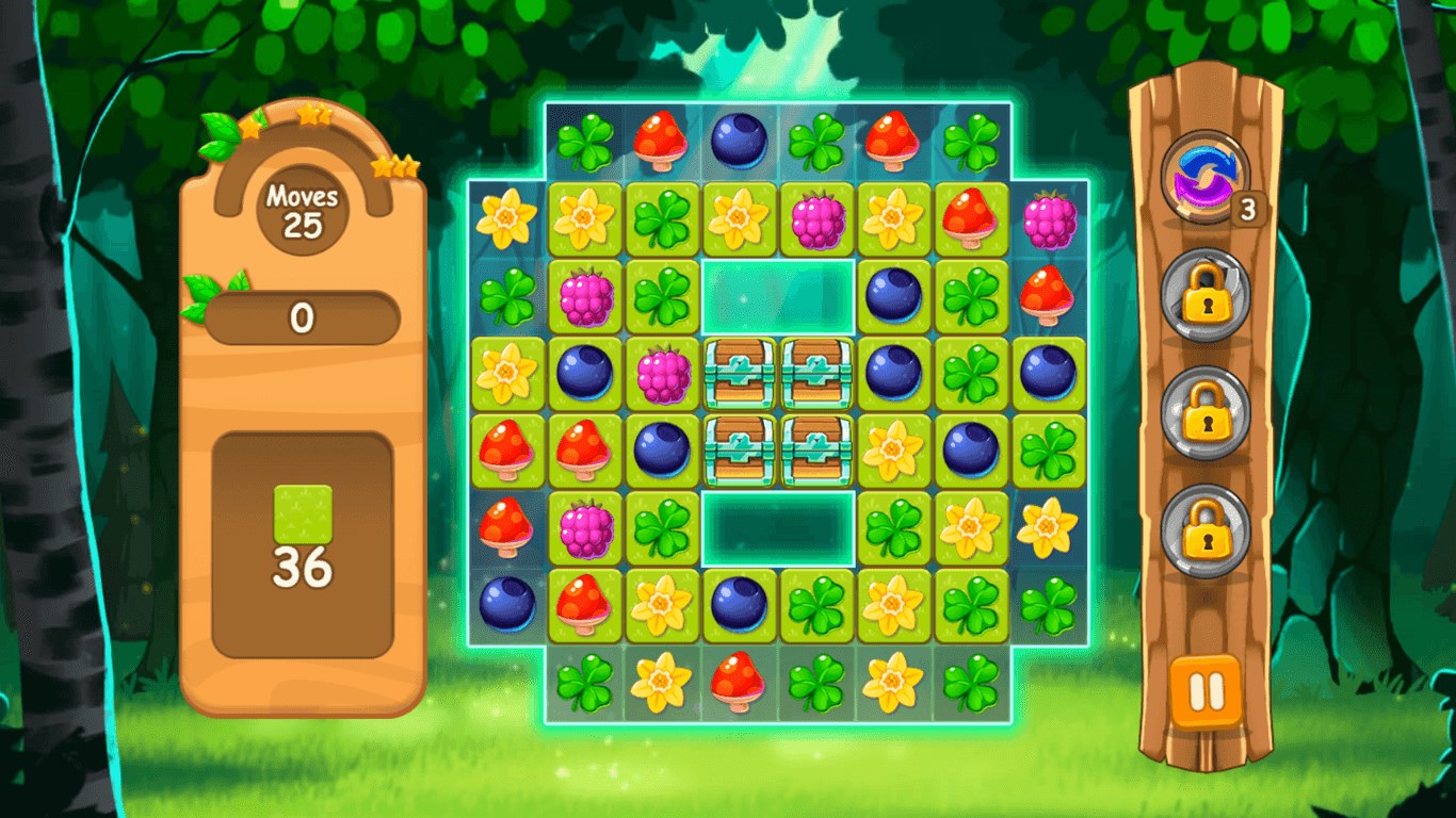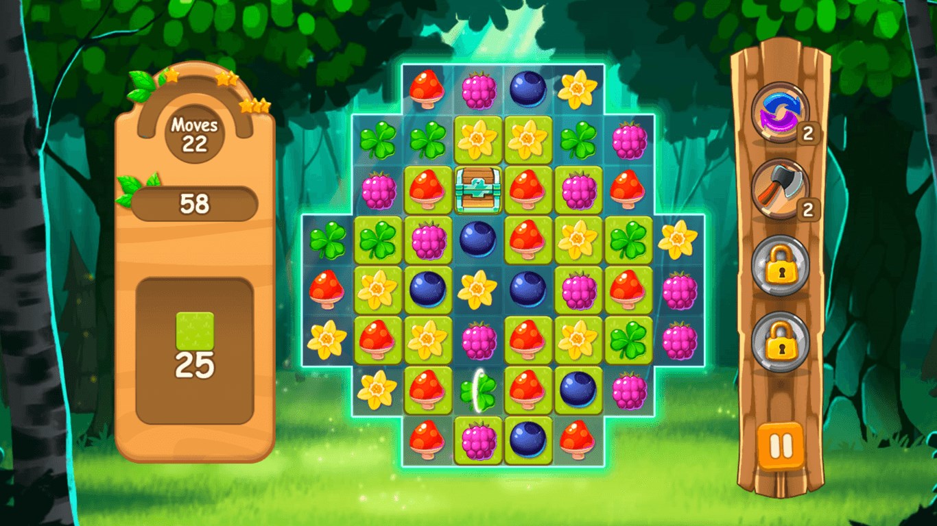 Its lovely graphic design and the atmospheric and catchy tune will quickly draw you into its spell. Earn points by combining the same kind of fruit, plant and other objects of the forest. Combine at least three identical objects to collect them or connect a larger number of identical objects to create powerful power-ups. These power-ups help you to remove soil, grass, moss, stone or ice and to collect the required number of objects to complete a level.