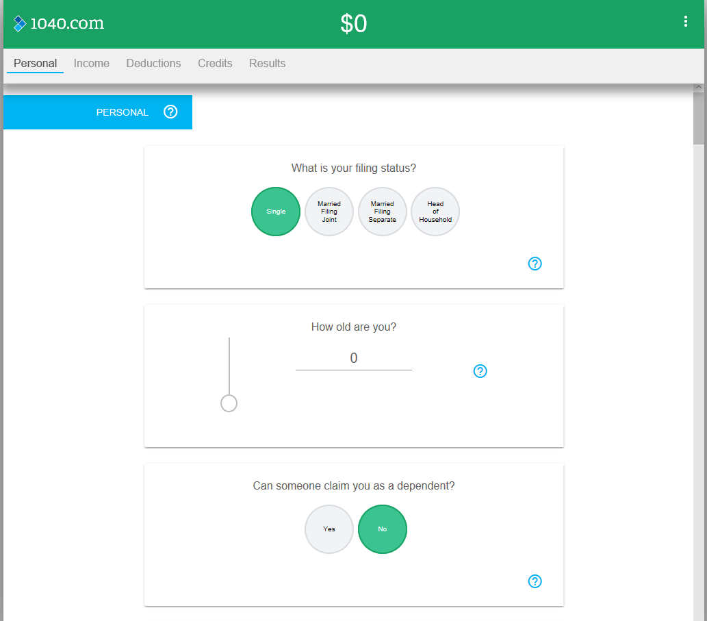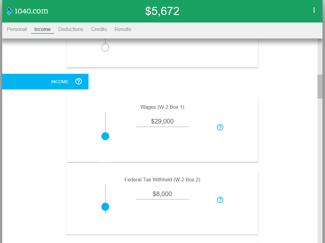 1040.com’s Tax Refund Calculator app helps you quickly estimate your income tax refund. You’ll need to input some basic information about yourself, your income, and any deductions or credits you anticipate. To navigate, drag up or down, or tap the headers at the top to move to each section. If you don’t know exact amounts, feel free to guesstimate.