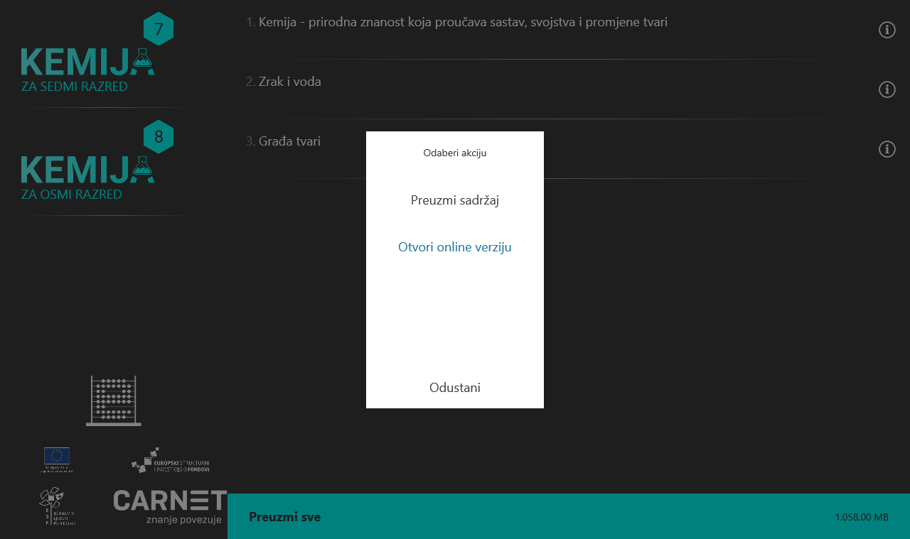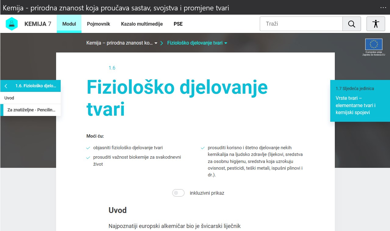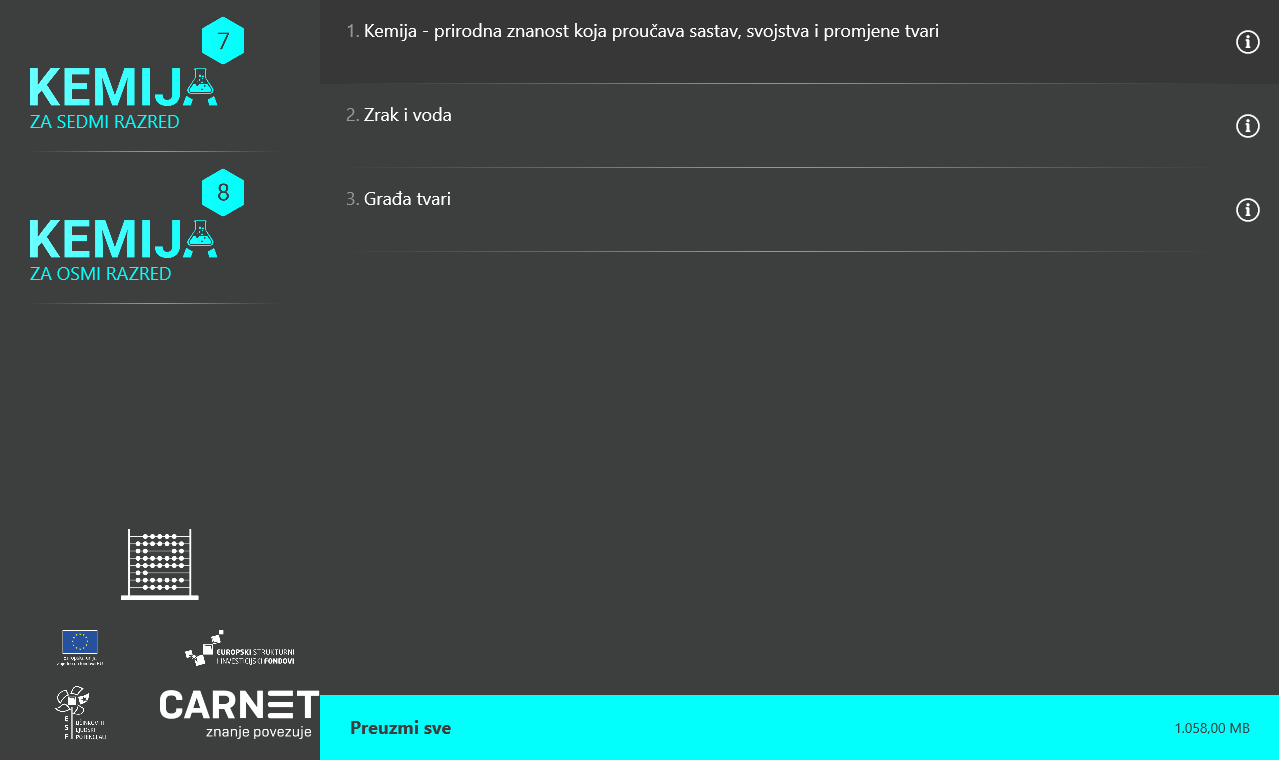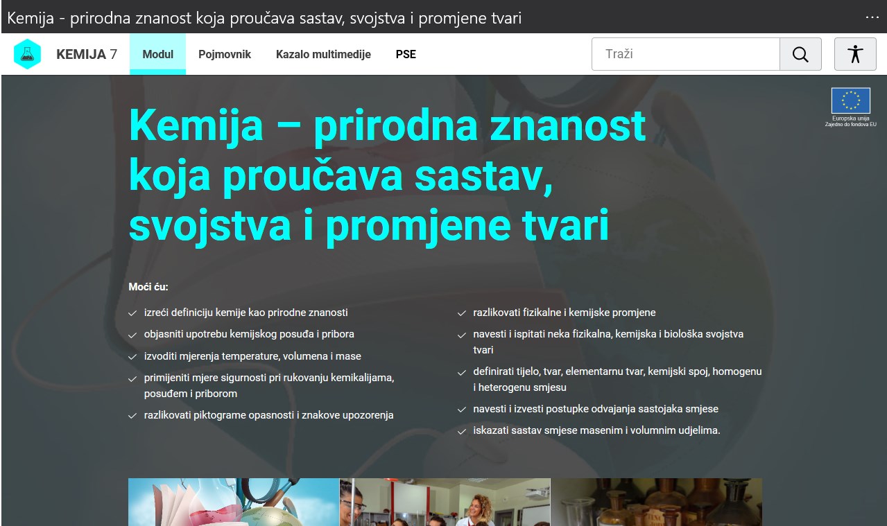 Kroz aplikaciju su dostupni digitalni obrazovni sadržaji za 7. i 8. razred predmeta Kemija. Izrađeni su u obliku manjih cjelina (modula) koje se može zasebno koristiti, ali pokrivaju gradivo cijelog razreda. Sadrže tekstualne, audio, video, multimedijalne i interaktivne elemente, kvizove, pitalice, vježbe, simulacije i animacije, kao i eksperimente i problemske zadatke. Aplikacija omogućava korištenje sadržaja online, a za korištenje offline potrebno je u aplikaciji preuzeti pojedine module. Pri korištenju sadržaja moguće je podesiti postavke koje reguliraju kontrast, povećanje i prilagodbu vrste slova i elemenata. Ovi sadržaji i aplikacija izrađeni su u sklopu projekta "e-Škole: Uspostava sustava razvoja digitalno zrelih škola”.