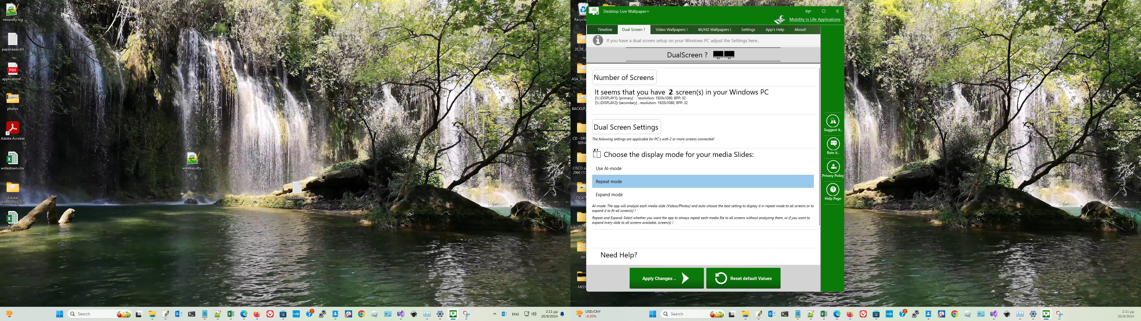 - Full support for dual screen PCs !! (you asked it, we build it (!)). The app auto-detects your monitor/monitors and provides you with a Live Wallpaper for your dual-screen (double monitor) PC. This feature comes with 3 different modes to select from: