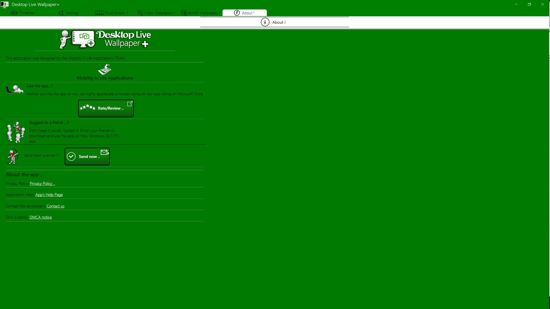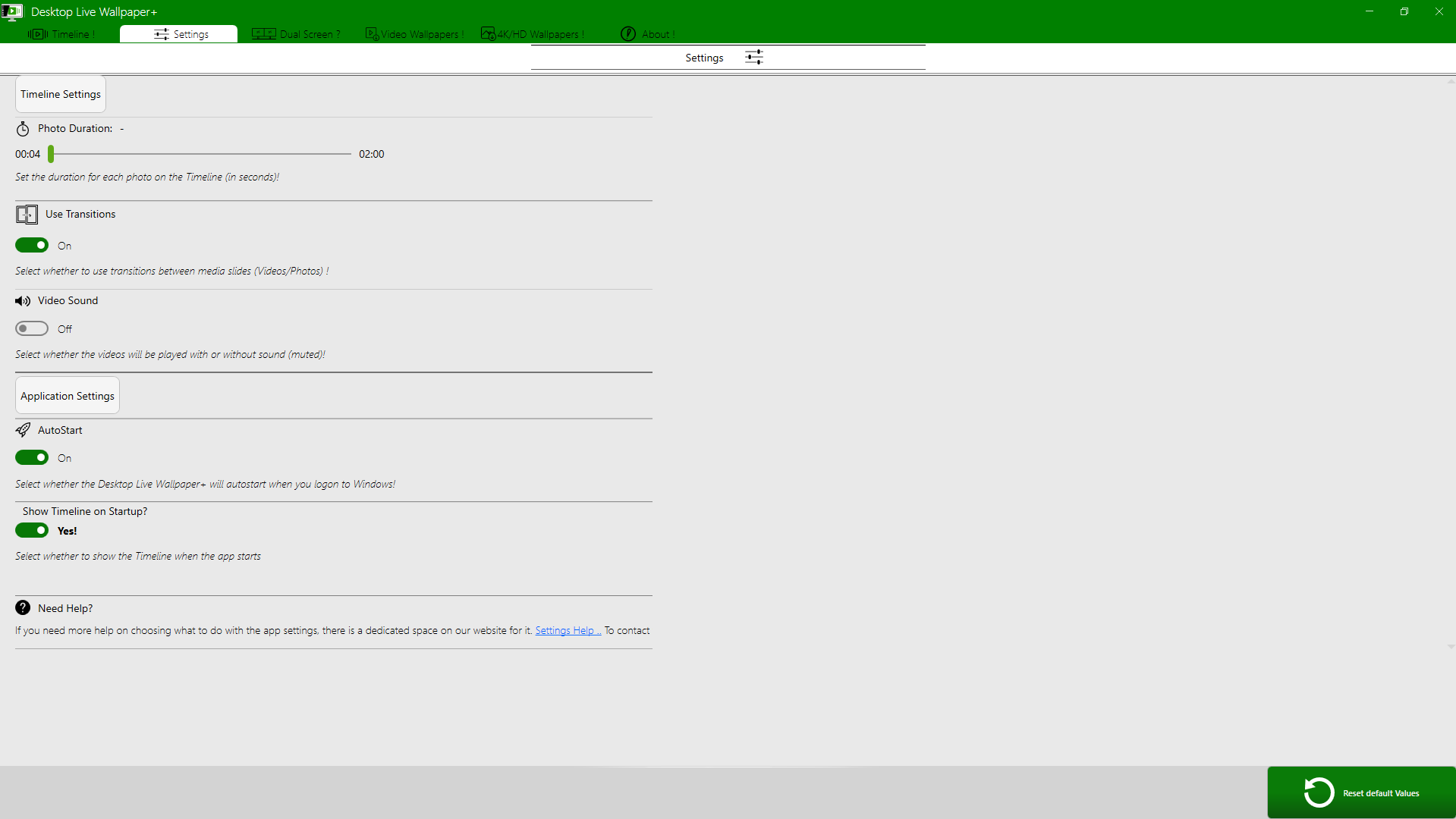 - apply a beautiful Live Timeline of your favorite photos and videos, directly into your Windows 10/11 Desktop- Almost all video file types supported (MP4, 3GP, MKV, FLV, AVI, MPEG, TS, etc. Also animated .Gif\'s supported- Advanced Video Effect Transitions between Media. Smooth even if you use only static Photo/Picture Wallpapers (!)- Gapless and smooth playback- Static HD Wallpapers supported: JPG,PNG, BMP - Adjust the photo duration and Control the sound of the Timeline- Adjust settings for startup of the app- Apply 15 * 5 = 75 different transition effects for switching photos/videos- Dual Screen support. The new feature has 3 modes: AI-mode, Expand mode or Repeated mode.