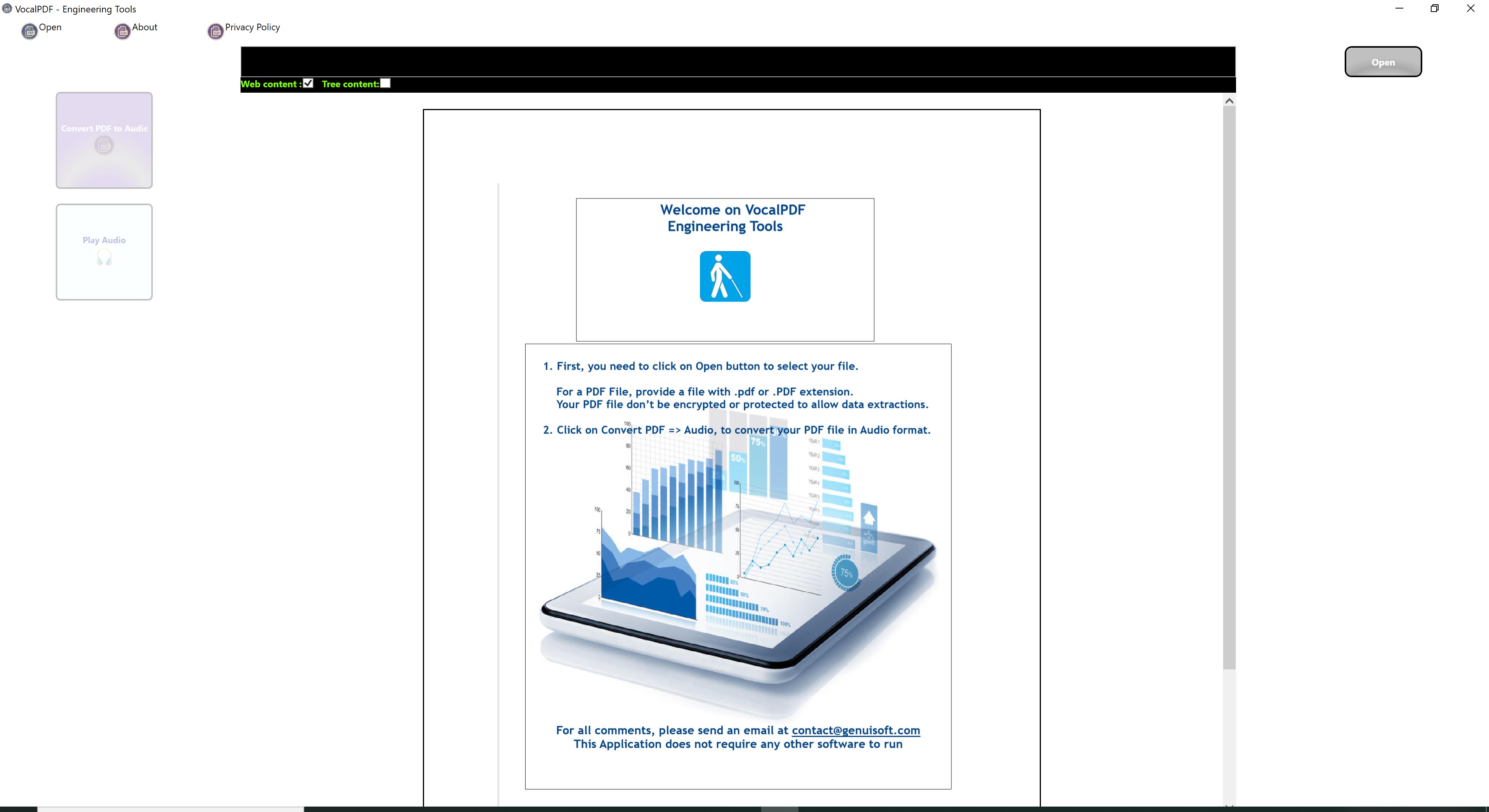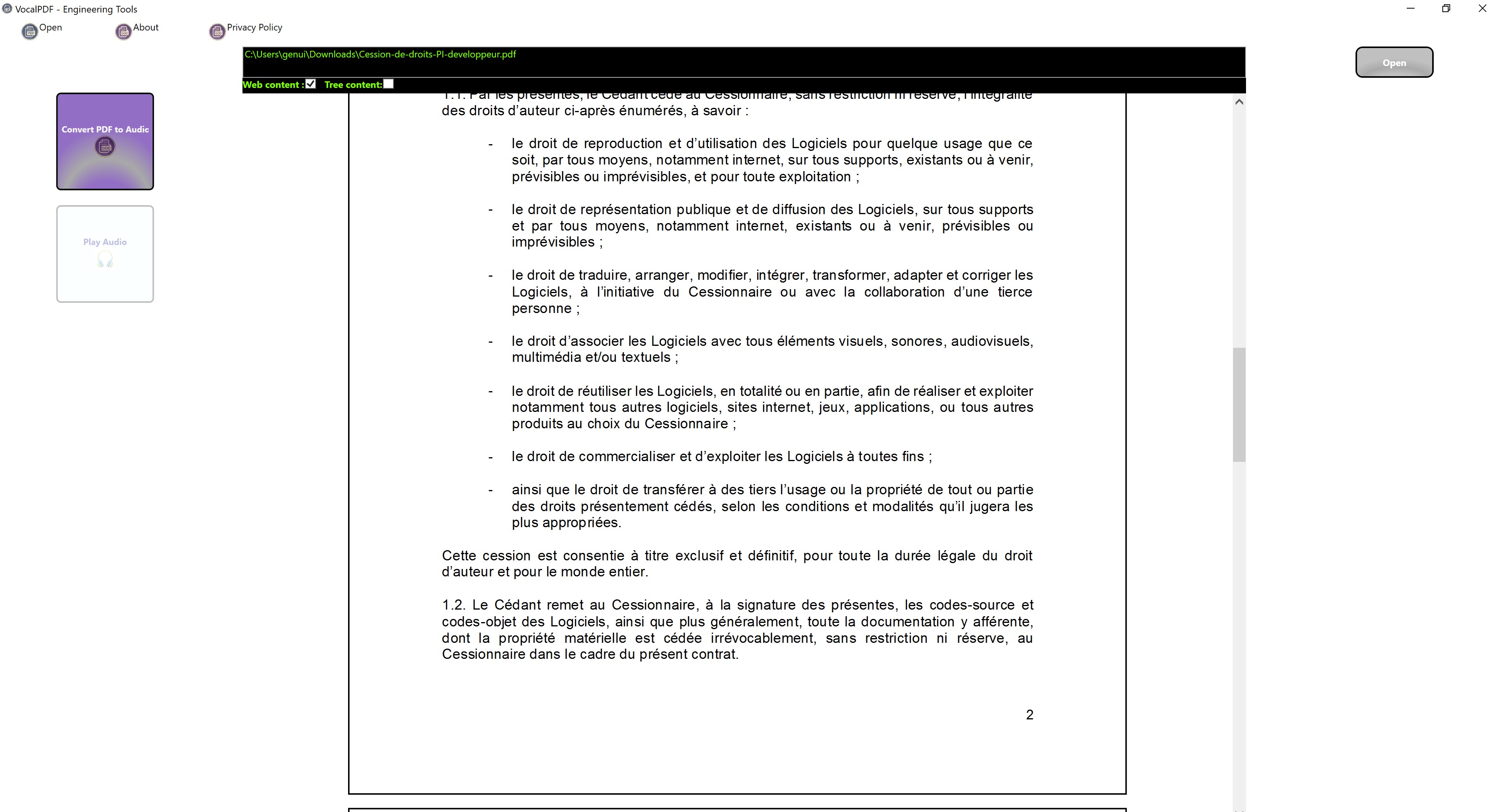 The purpose of this application is to transform any PDF document into a voice audio file allowing, among other things, to help visually impaired people. No data is collected, just an audio file is created in the user's documents.