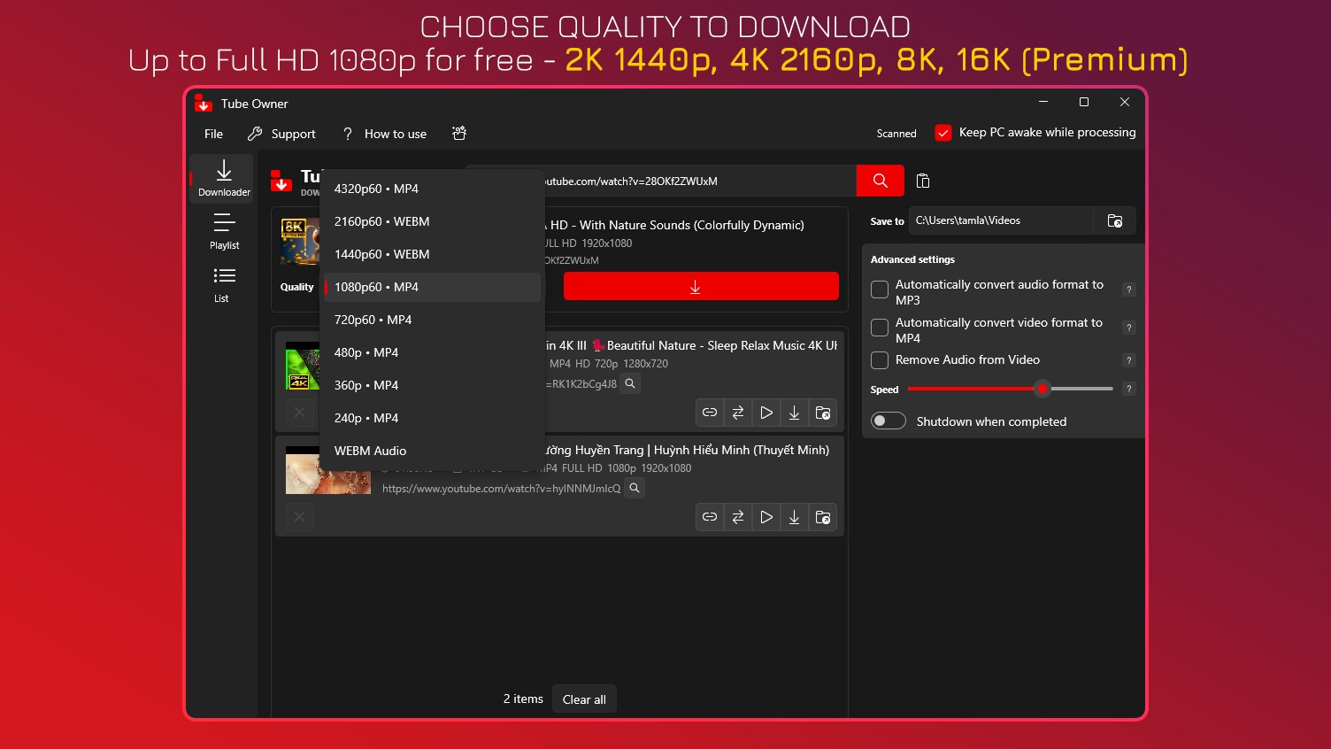 ⭐ DOWNLOADER: Support up to Full HD 1080p, YT Short for free - 2K 1440p, 4K 2160p, 8K, 16K in Premium.