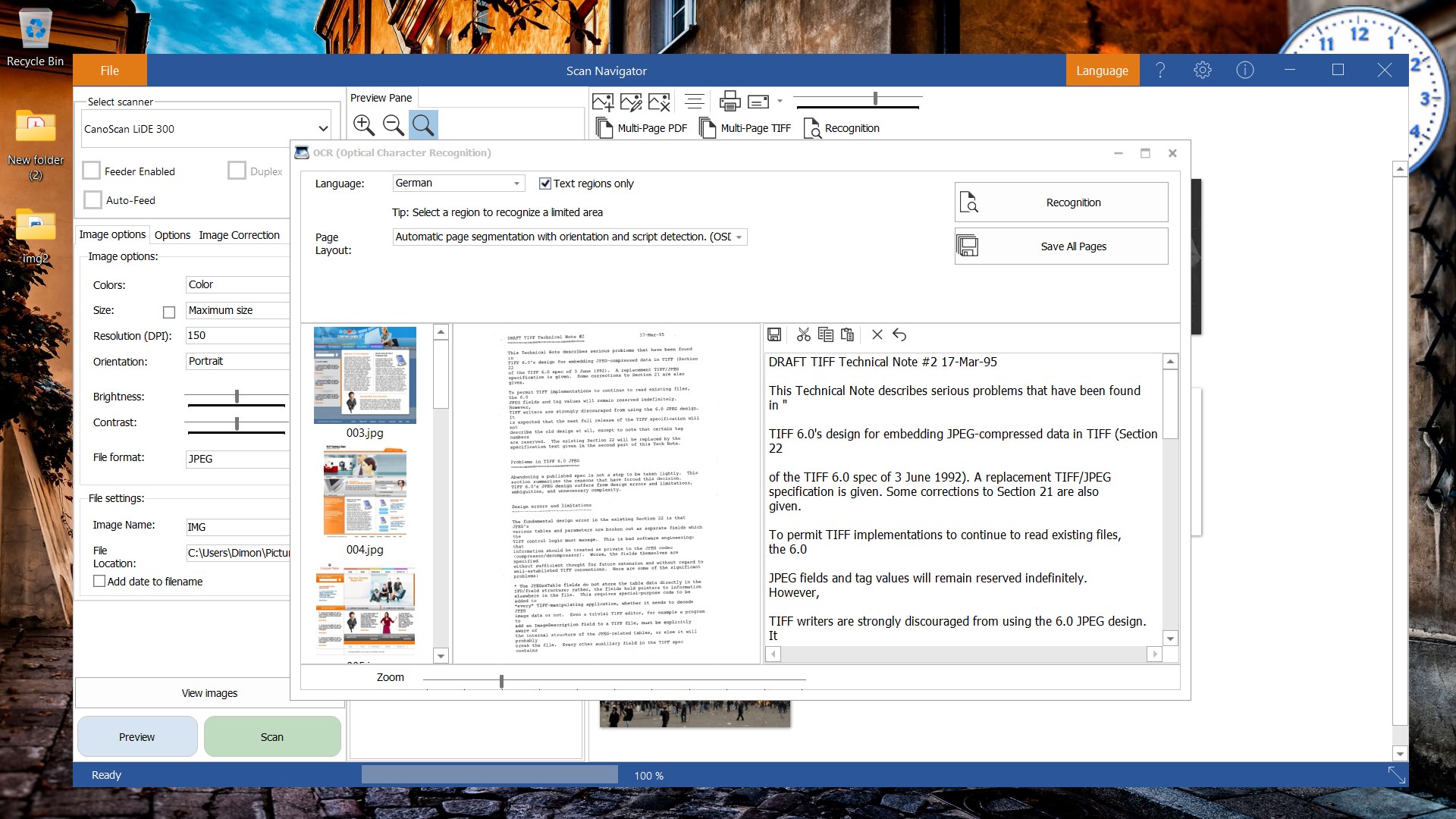 Scan and preview settings: set color (color, black & white, gray-scale), resolution, and size of output images.Image correction options: Auto sharpness, Improvement of contrast and colors, Auto image enhance, Enhance luminosity, Unsharp mask, Auto white balance, Sharpen.Save scanned images as PDF, BMP, JPG, TIFF, or PNG imagesSupport of ADF (auto document feeder) and duplex scanningSave scan settings to profilesCrop, rotate, sharpen, adjust colors, apply various image effectRemove Red-EyesSave scanned documents as a multi-page PDFSave recognized text to DOCX, RTF or TXT formats (all pages or individually)OCR for 15 languages