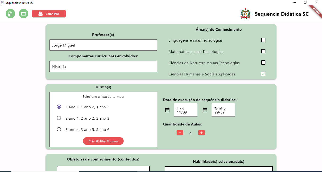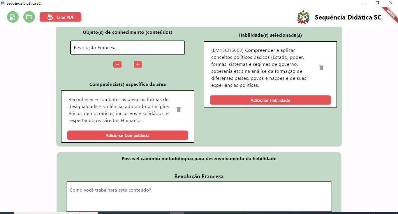 Aplicativo para professores estaduais de Santa Catarina criarem a sequência didática de forma mais rápida e simples. O app possui um conjunto de dados salvos que facilitam a elaboração da sequência didática, como: dados da BNCC, Currículo Território Catarinense e outras informações.
