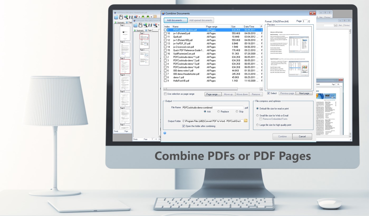 "Combine PDF - PDFCool" allows the user to combine a variety of individual PDF documents into a new PDF document. The user can choose to combine all pages or partial pages of the documents.