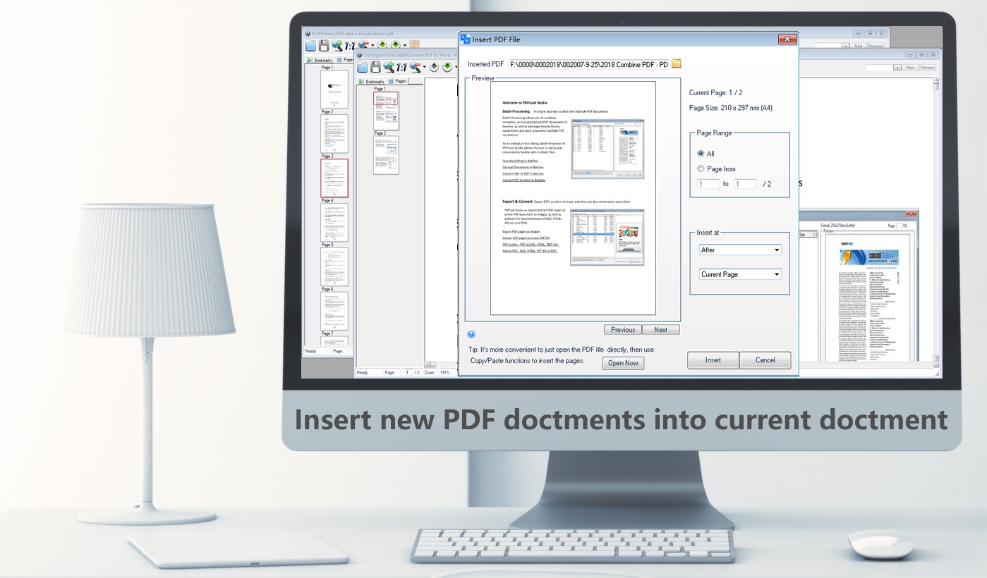"Combine PDF - PDFCool" is a lite version of PDFCool Studio, it's an easy to use but powerful PDF document handler. It can be used to combine, split and compare PDF documents. The "Insert Doctments" function allows you adding all or partial pages of a certain PDF document easily to the current PDF document.