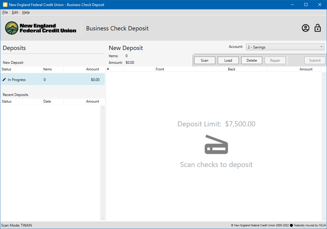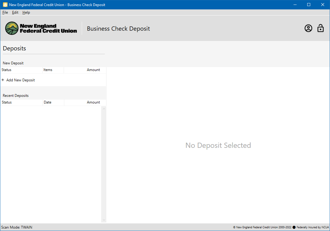 NEFCU Check Deposit enables business banking users to make multi-check deposits to their accounts using any TWAIN, WIA or Ranger enabled scanner. The application has a user-friendly interface design and is especially designed for high-volume deposits and high-performance check scanners.