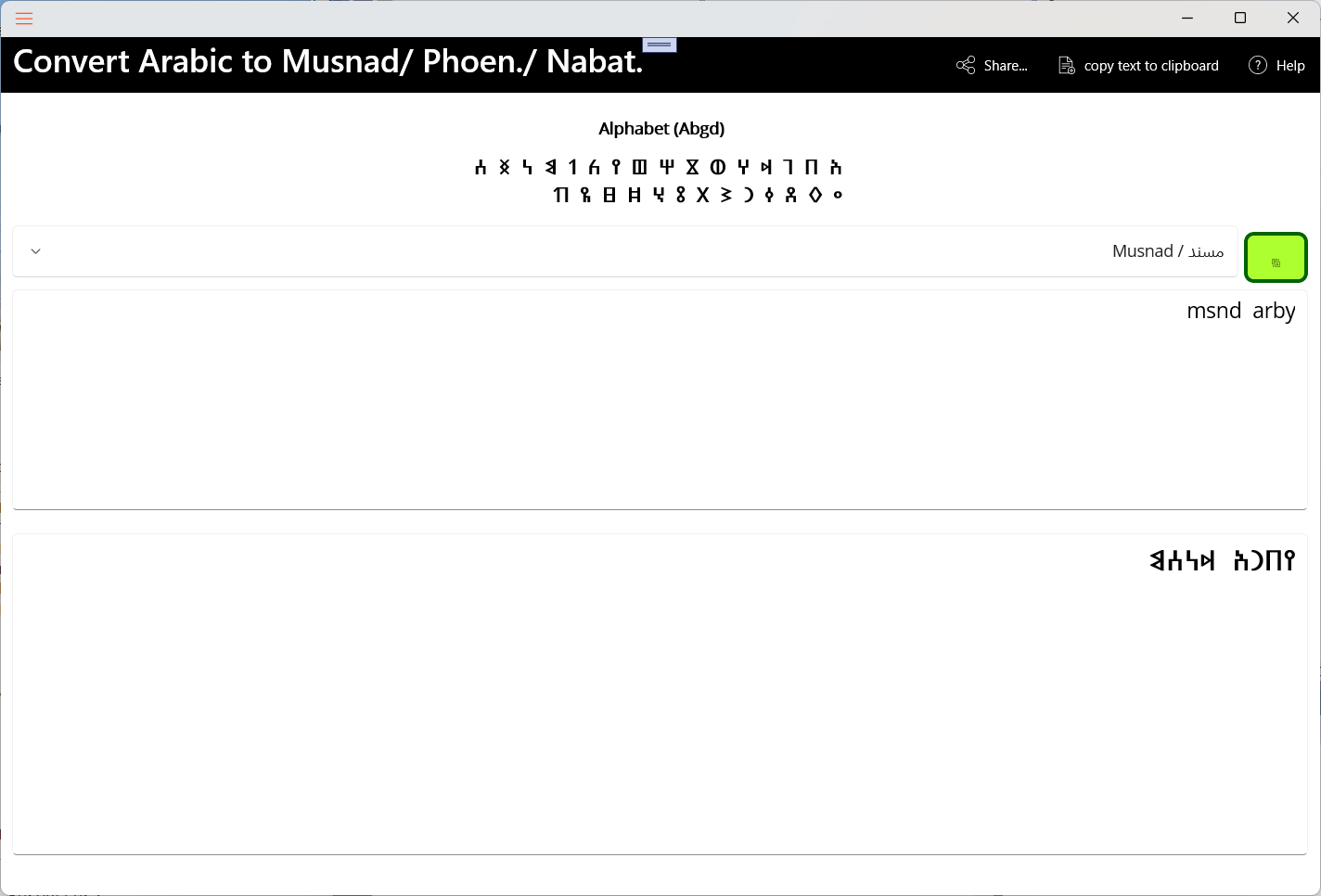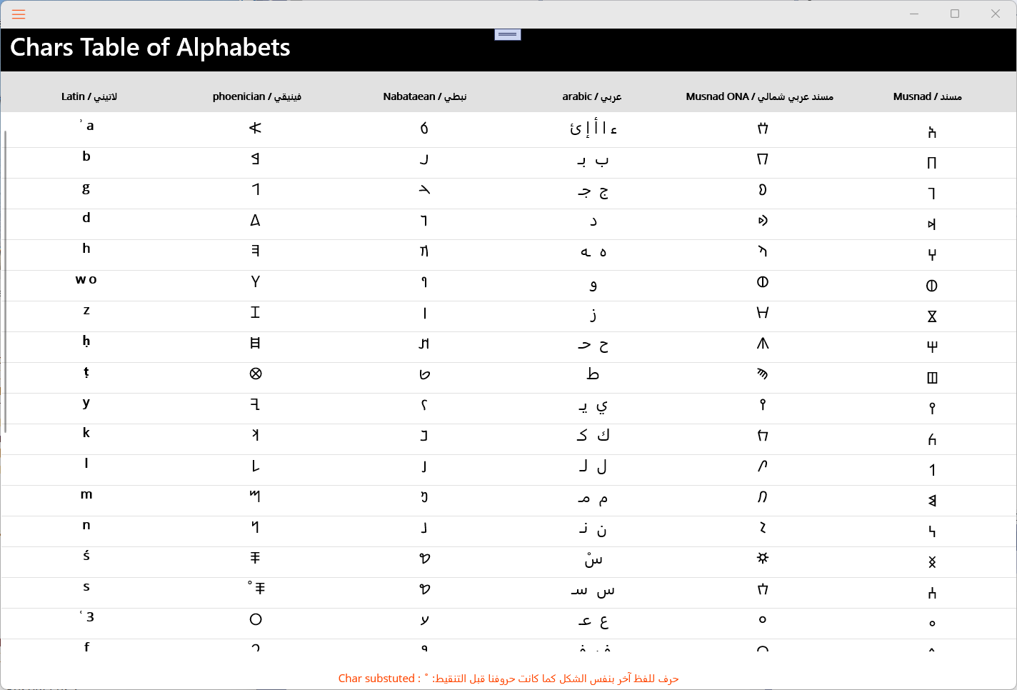 The application also includes a list of ancient Arabic alphabets, as well as an application to convert text from Arabic to the old Musnad Arabic script, or to the Arab Nabataean script, etc.