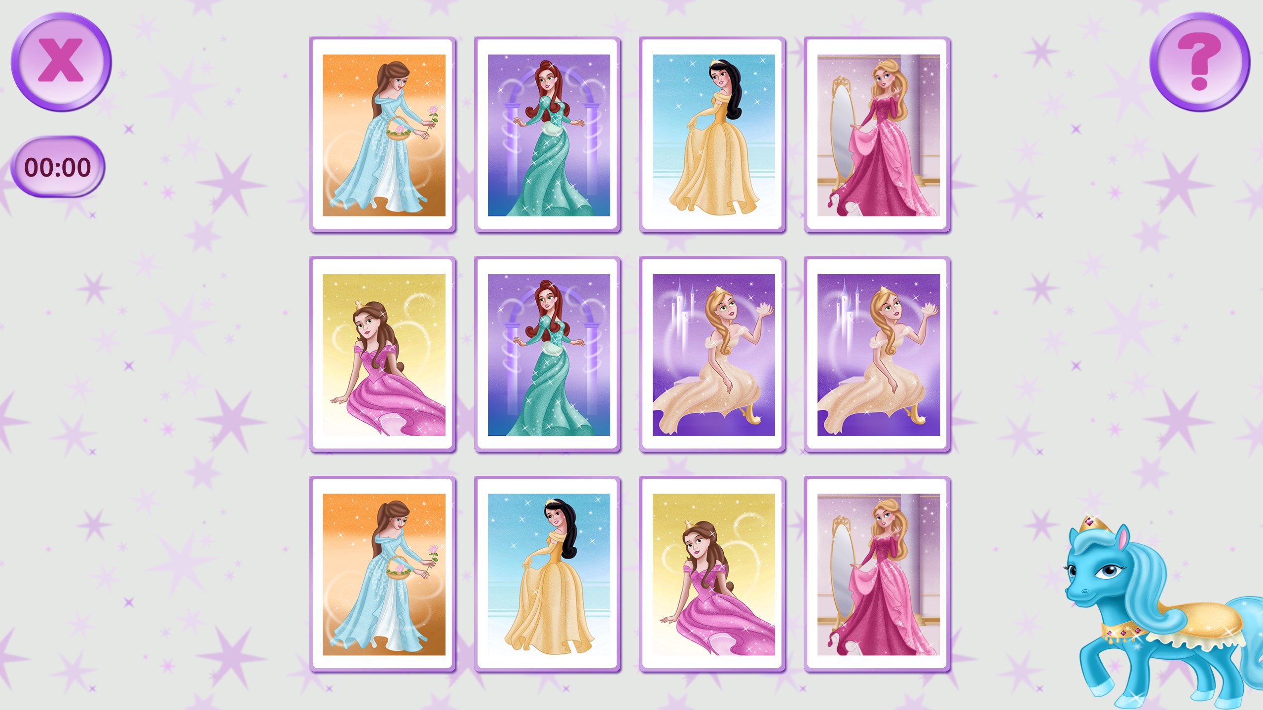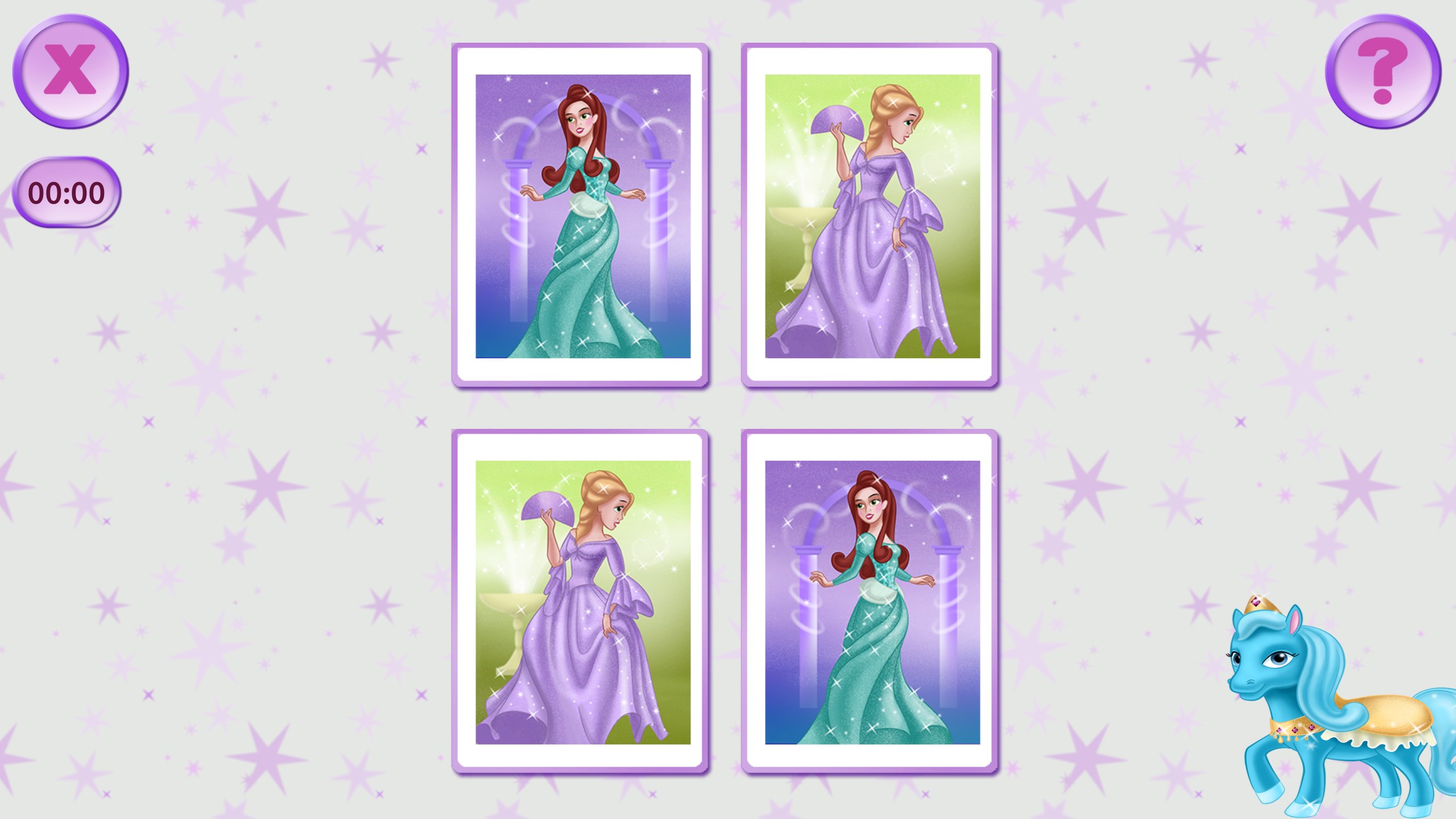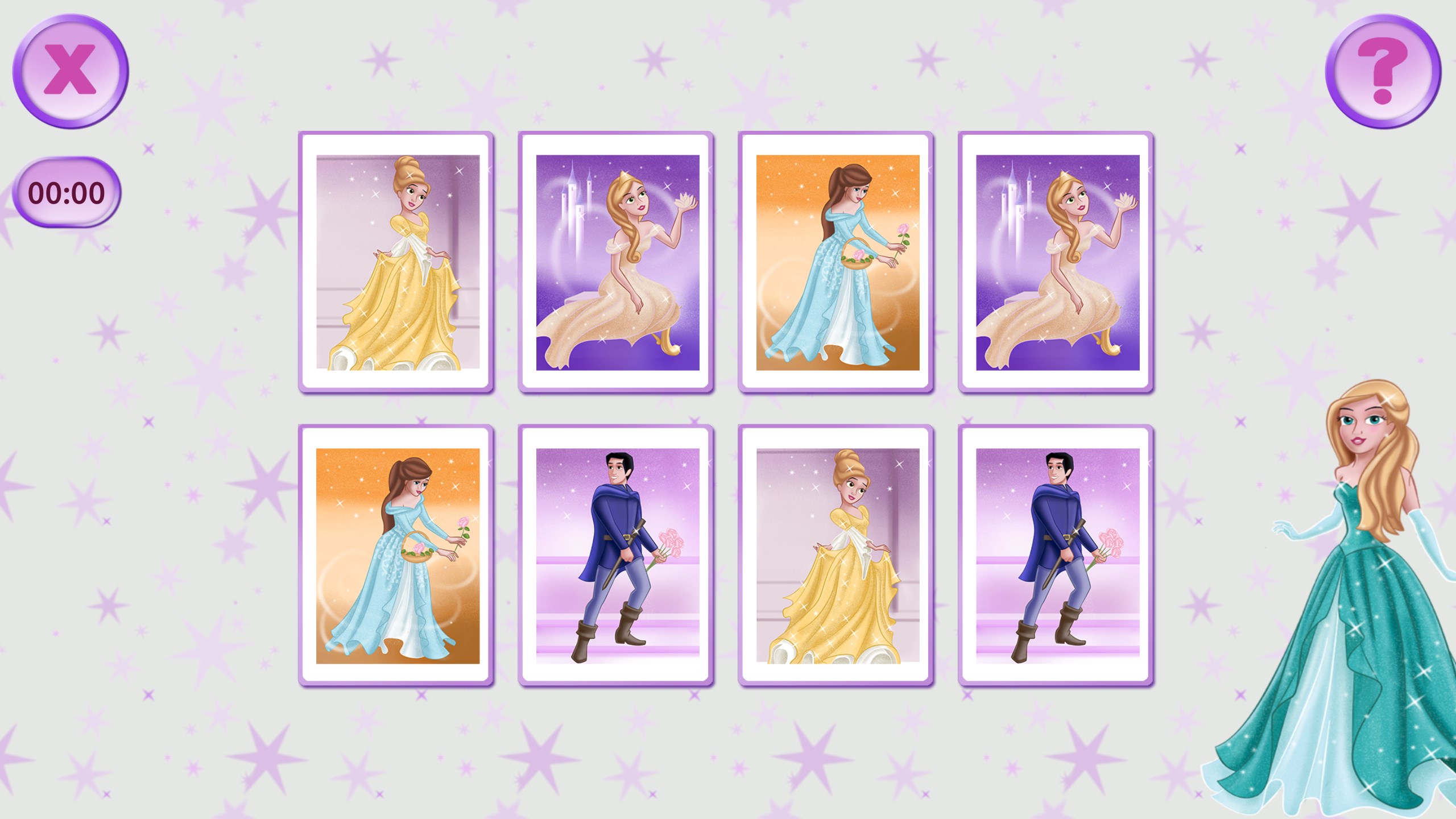 Press any 2 cards, and they will flip. If both cards have the same princesses, they will stay open. If the pictures are different, the cards will close again. Your task is to keep opening cards randomly to memorize the pictures on them and finally open all the cards on the field.