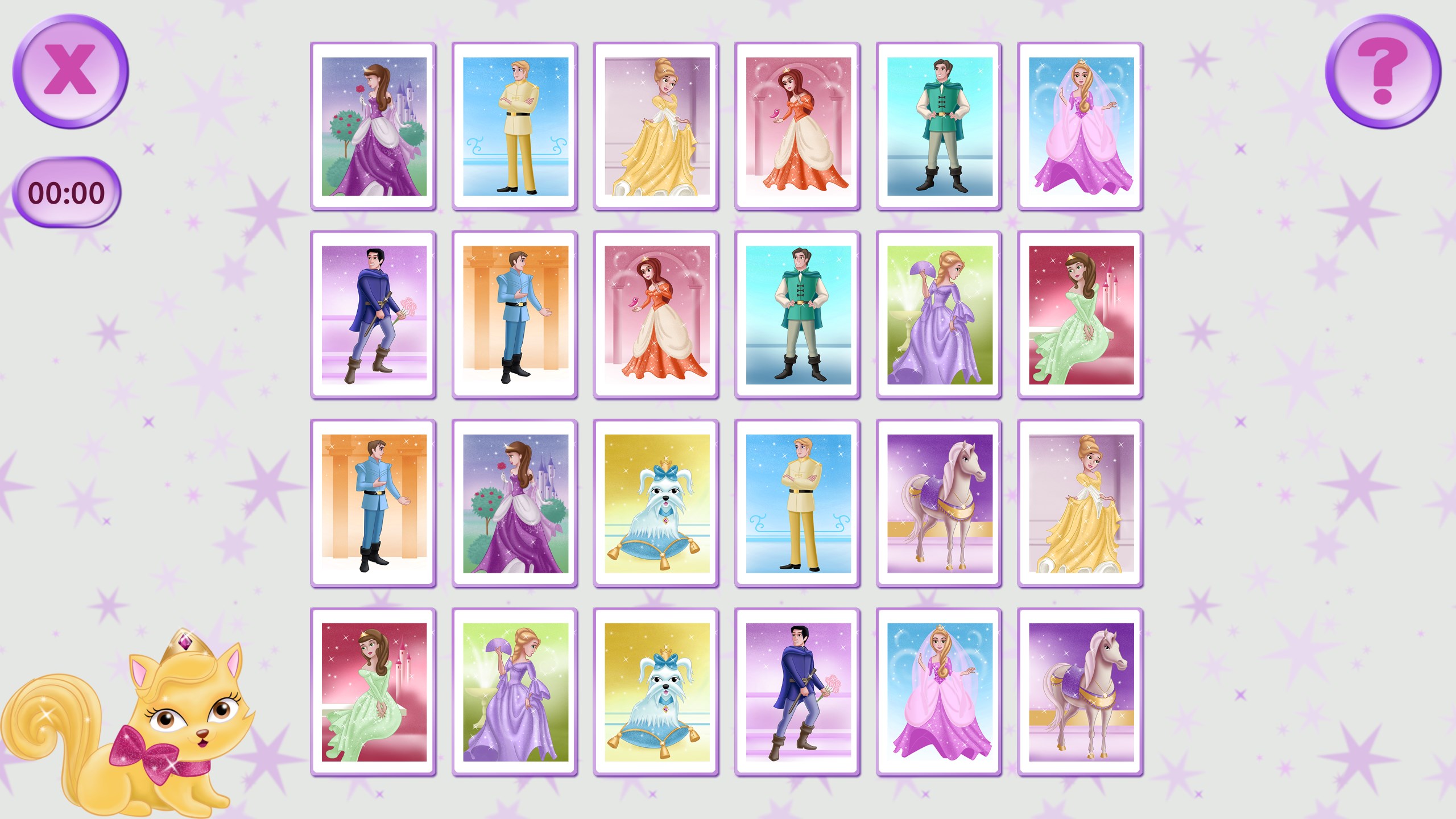 Flip the cards to match pictures of princesses, princes and royal animals!