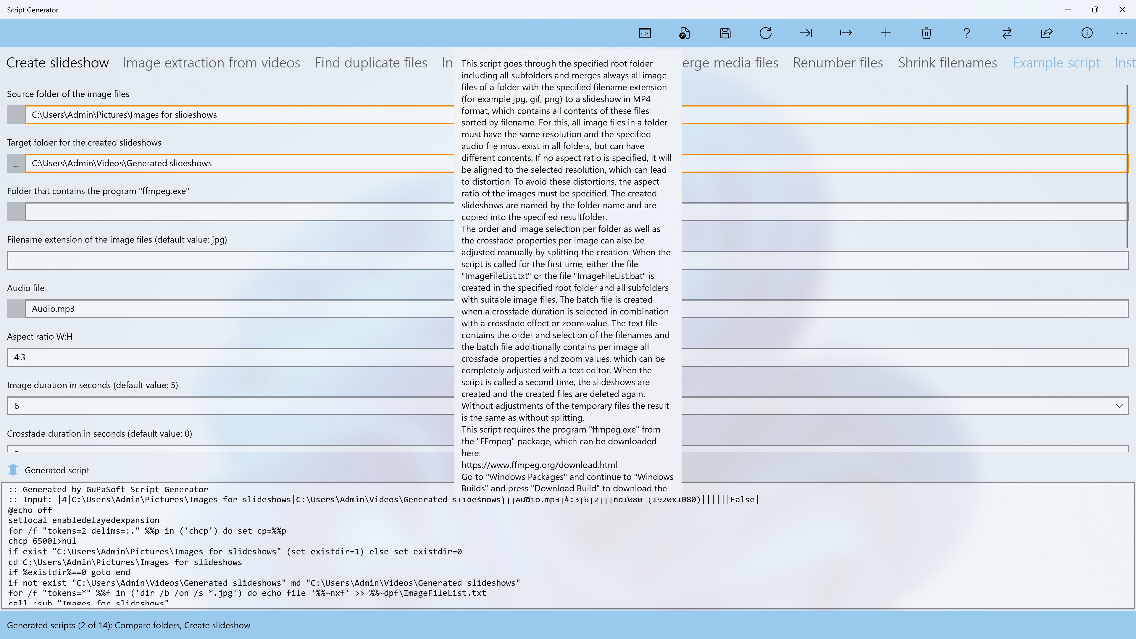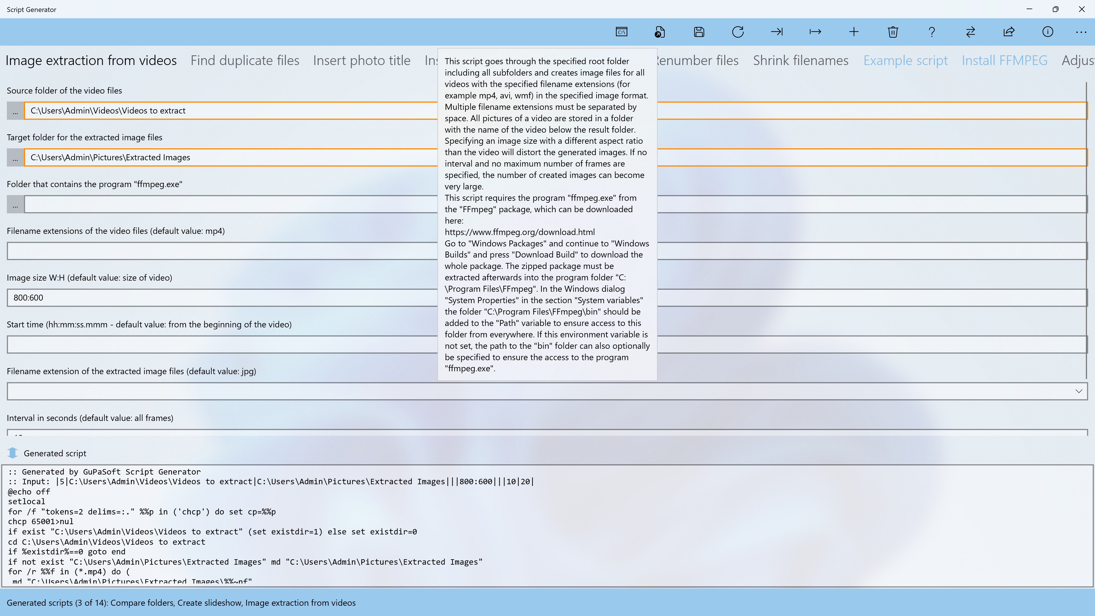 Script generation and administrationThe app contains configurable batch files for the following twelve common use cases:Adjust images, Adjust videos, Backup user data, Compare folders, Create slideshow, Image extraction from videosFind duplicate files, Insert photo title, Insert video title, Merge media files, Renumber files, Shrink filenamesCreation of custom script files which are extensible with placeholders which are replaced by the values of the configured input fields when generatingThe following custom sample script is included, which, like any custom script, is based on an XML file which can be exported:Batch script that shows all the configuration options of the input fieldsSupports Intel Quick Sync Video, Nvidia NVENC and AMD VCE in video encoding