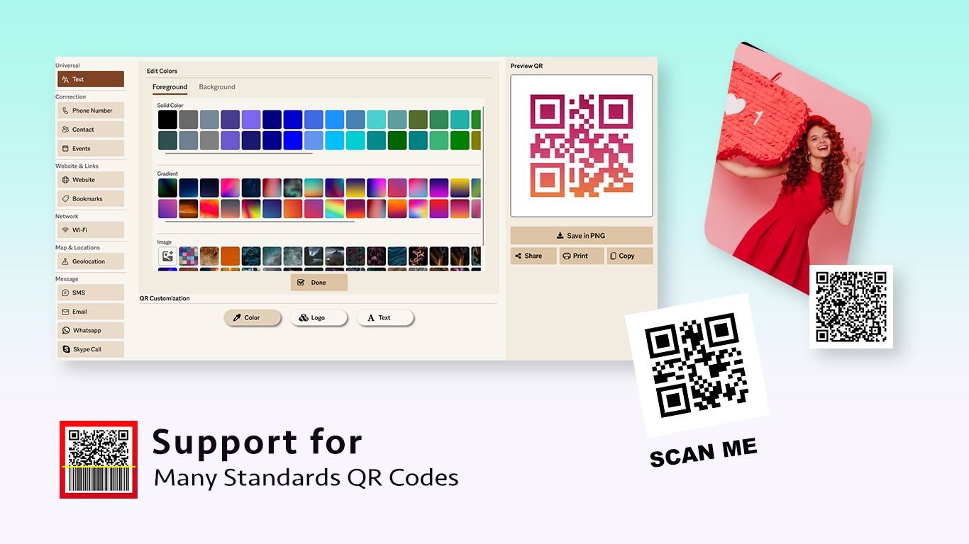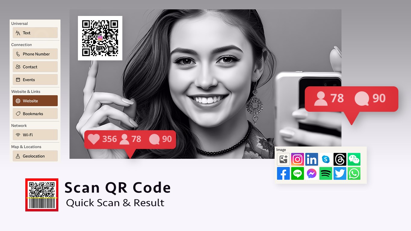 • Versatile QR Code Options: Encode everything from website links to WhatsApp messages, Skype calls, and beyond.
