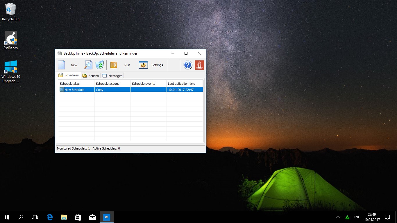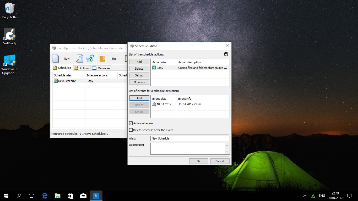 BackUpTime has been specially designed to make it easy to use. You will learn how the program works in less then 10 minutes. This software features straitforward, eye-pleasing interface, dynamic folders (unique feature that other backup utilities don't have), and built-in scheduler. You can even use the software to set alarms to remind you of important events. The program supports 7-zip compression format which has long been recognized as an industry standard. The built-in scheduler allows you to set times for certain tasks (such as disk cleanup or disk scanning) so that these tasks will be performed when you want.