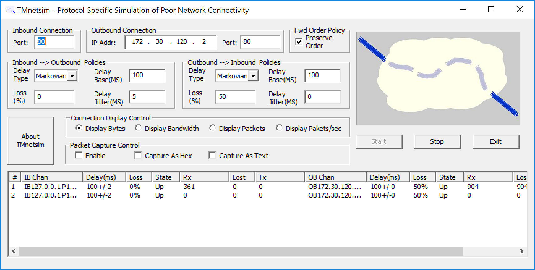 TMNetsim is primarily used to simulate network delay, however, in some cases it may be used to simulate packet loss or out-of-order delivery, as well as packet capture. Settings to control delivery delay and loss may be set on a global basis or per conversation basis. These parameters may also be set in a per-direction basis. A monitor allows you to view current conversations, and you may select specific instances to modify parameters for that connection on-the-fly.