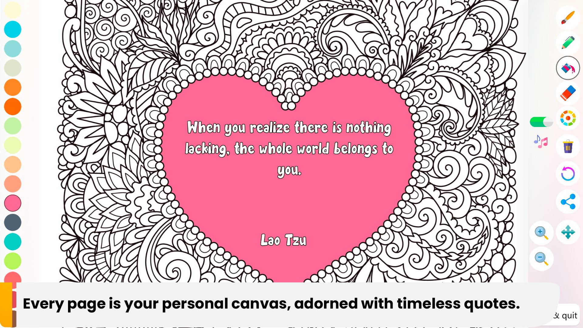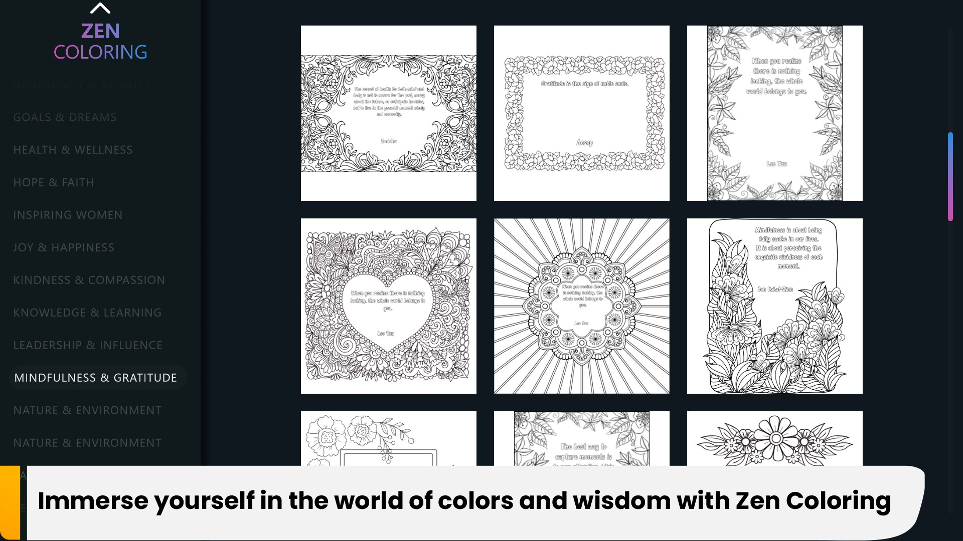 Unleash creativity with Zen Coloring: Motivational Quotes Coloring; art, relaxation & inspiration in one!Find peace & color your way to wisdom with thousands of beautiful pages on Zen Coloring app!Turn every coloring page into a personal masterpiece with Zen Coloring. Download today!Transforming simple doodling into inspiring art. Be inspired, be creative, be you!Share inspiration & joy with Zen Coloring\'s shareable masterpieces. Make life a colorful journey!