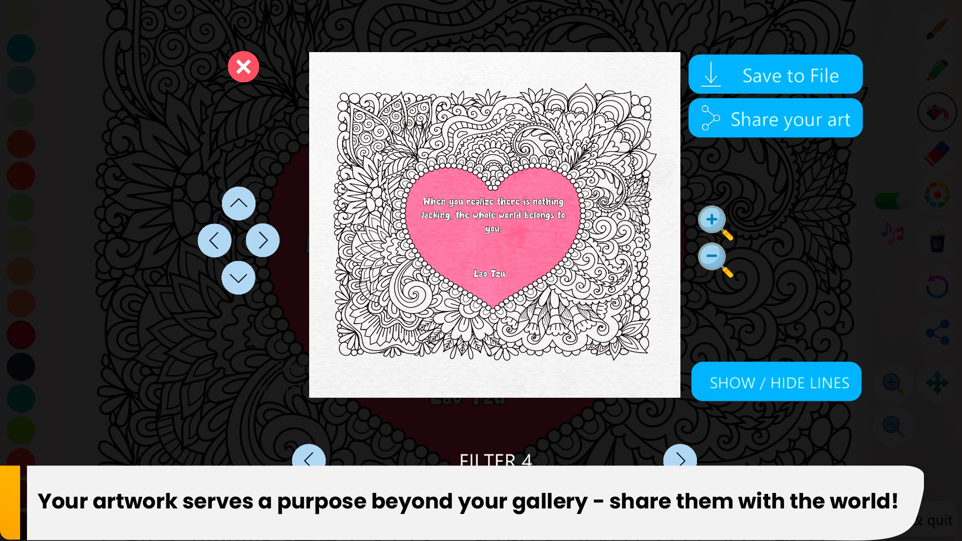The art you create isn't just to keep for yourself. Zen Coloring: Motivational Quotes Coloring lets you proudly share your marvelous creations with the world, so you can spread the inspiration and joy. The positivity and insight you share might just be the highlight of someone's day!