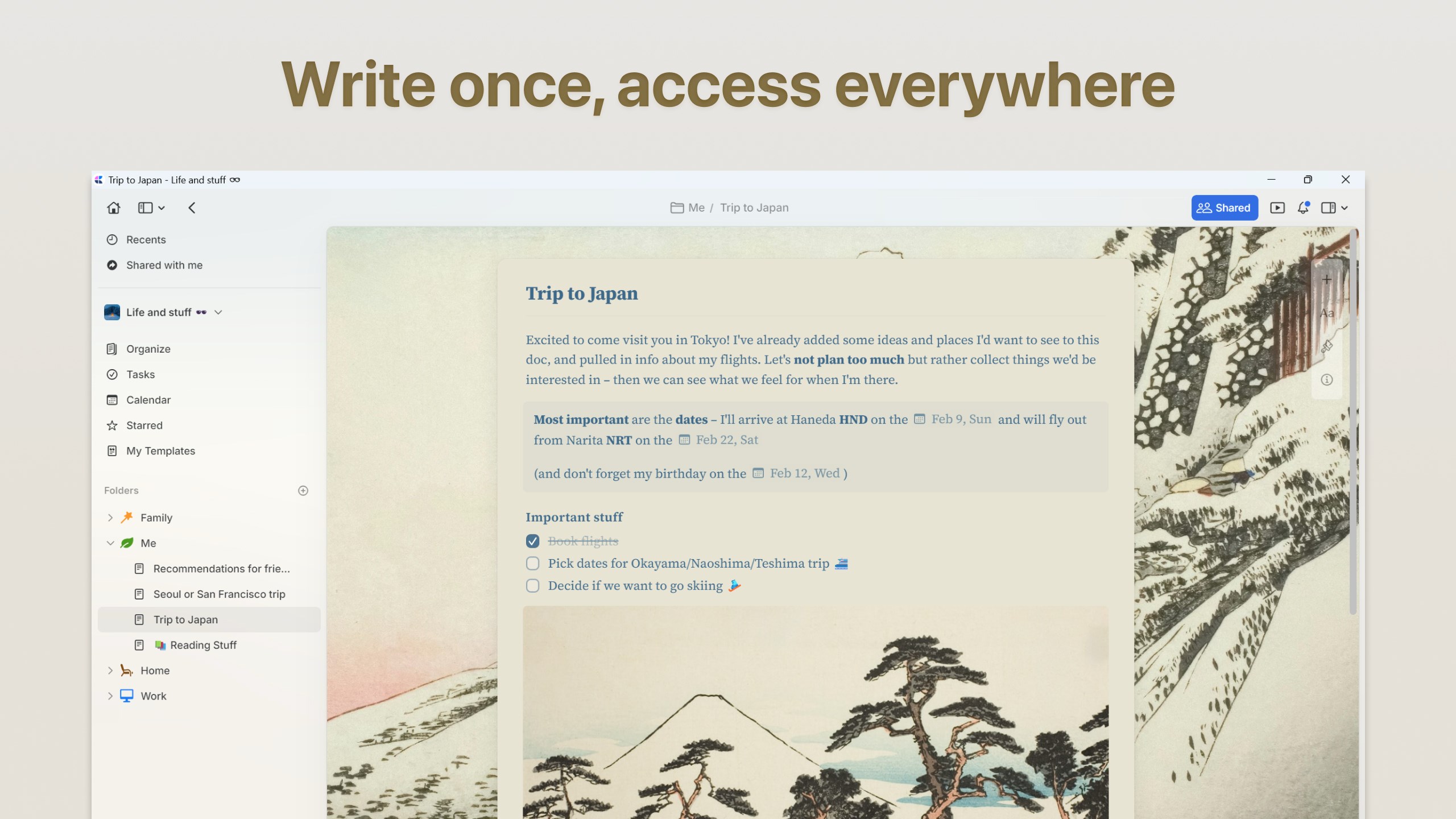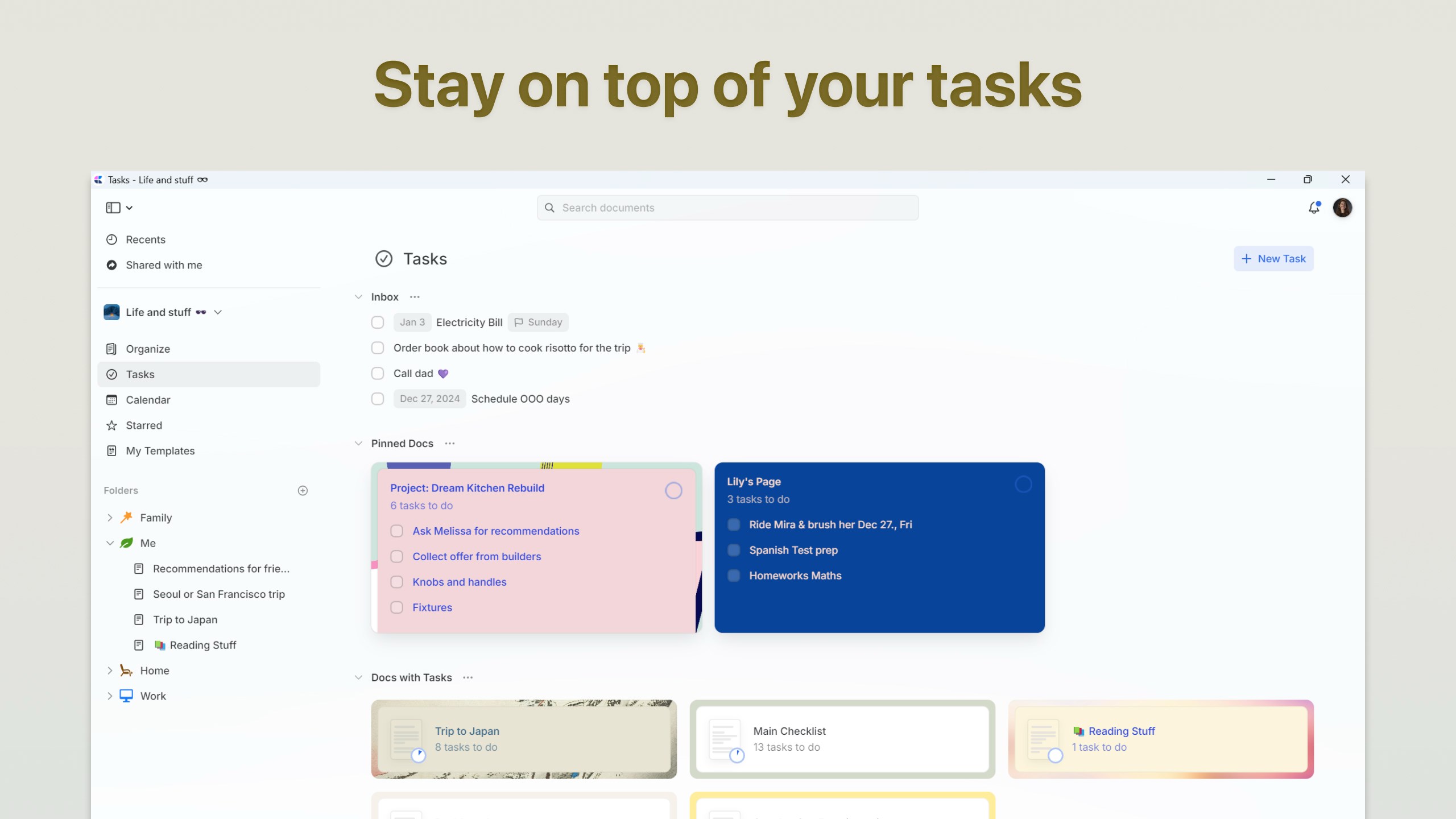 Turn your ideas into action with our native Tasks system. Capture tasks as they emerge from your notes and documents, manage them in a dedicated Inbox, and pin important projects for quick access. Set target dates, due dates, and reminders to stay on track. With a unified tasks view in the sidebar, you’ll never lose track of action items buried in your documents.