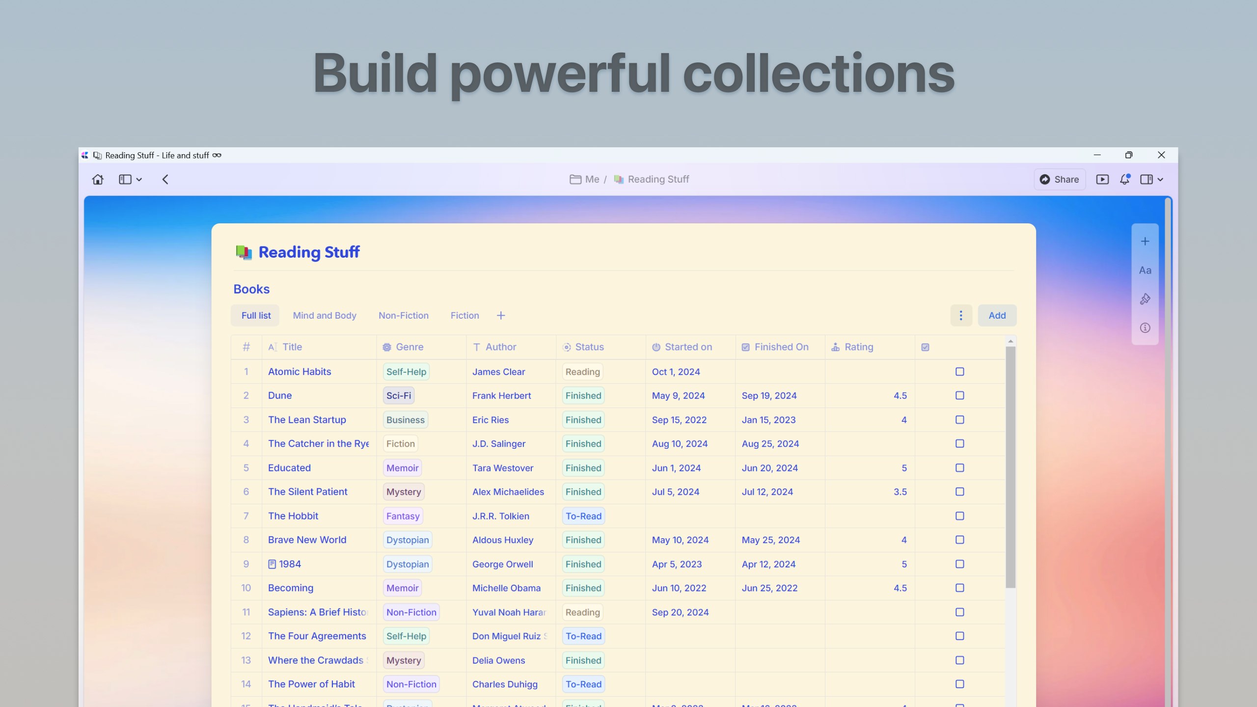 Transform your documents into dynamic databases with Collections. Create and embed customizable lists of records directly within your documents, complete with custom properties, tags, and flexible viewing options. Connect blocks and mentions across your Collections to build an interconnected knowledge base that grows with your needs.