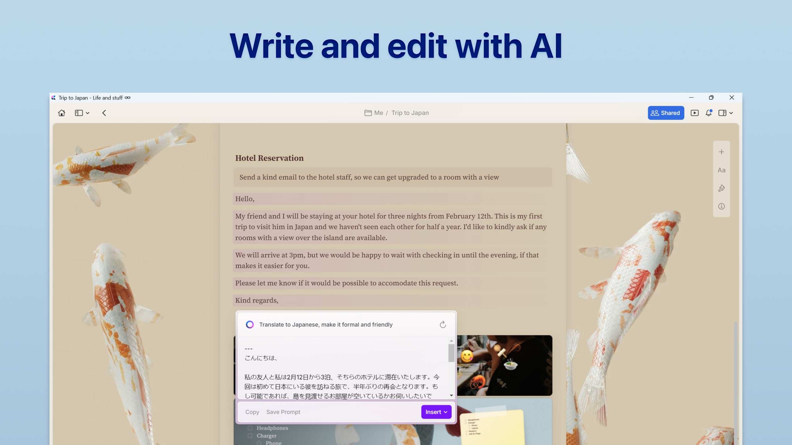 Work faster with the built-in AI Assistant. Instantly brainstorm ideas, summarize long documents or edit your notes for tone and style.