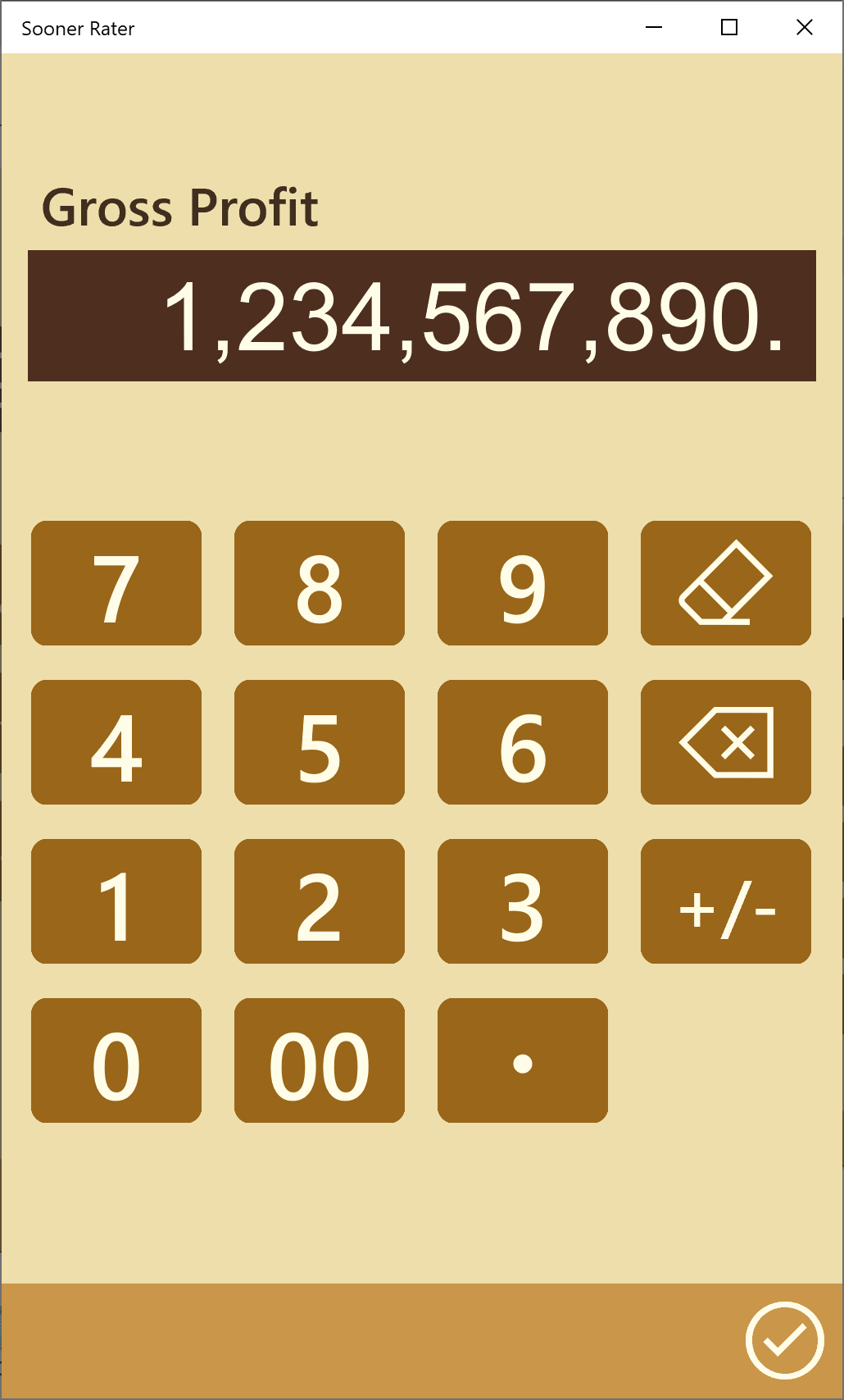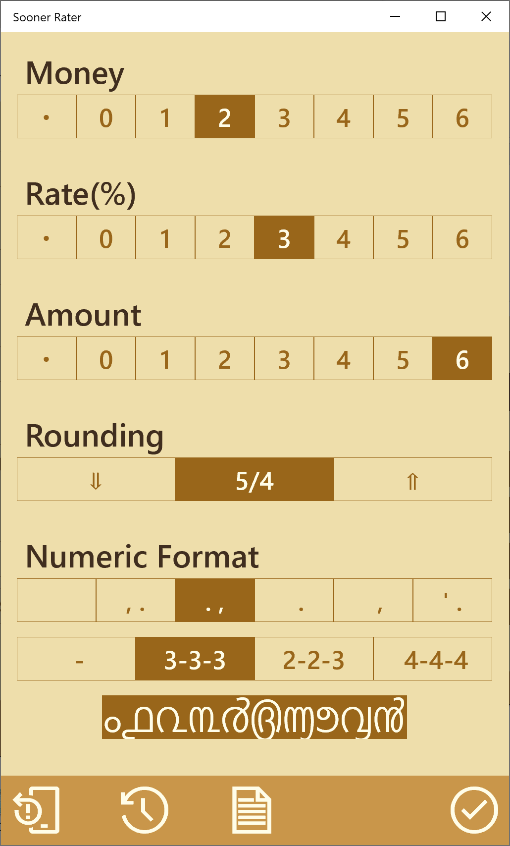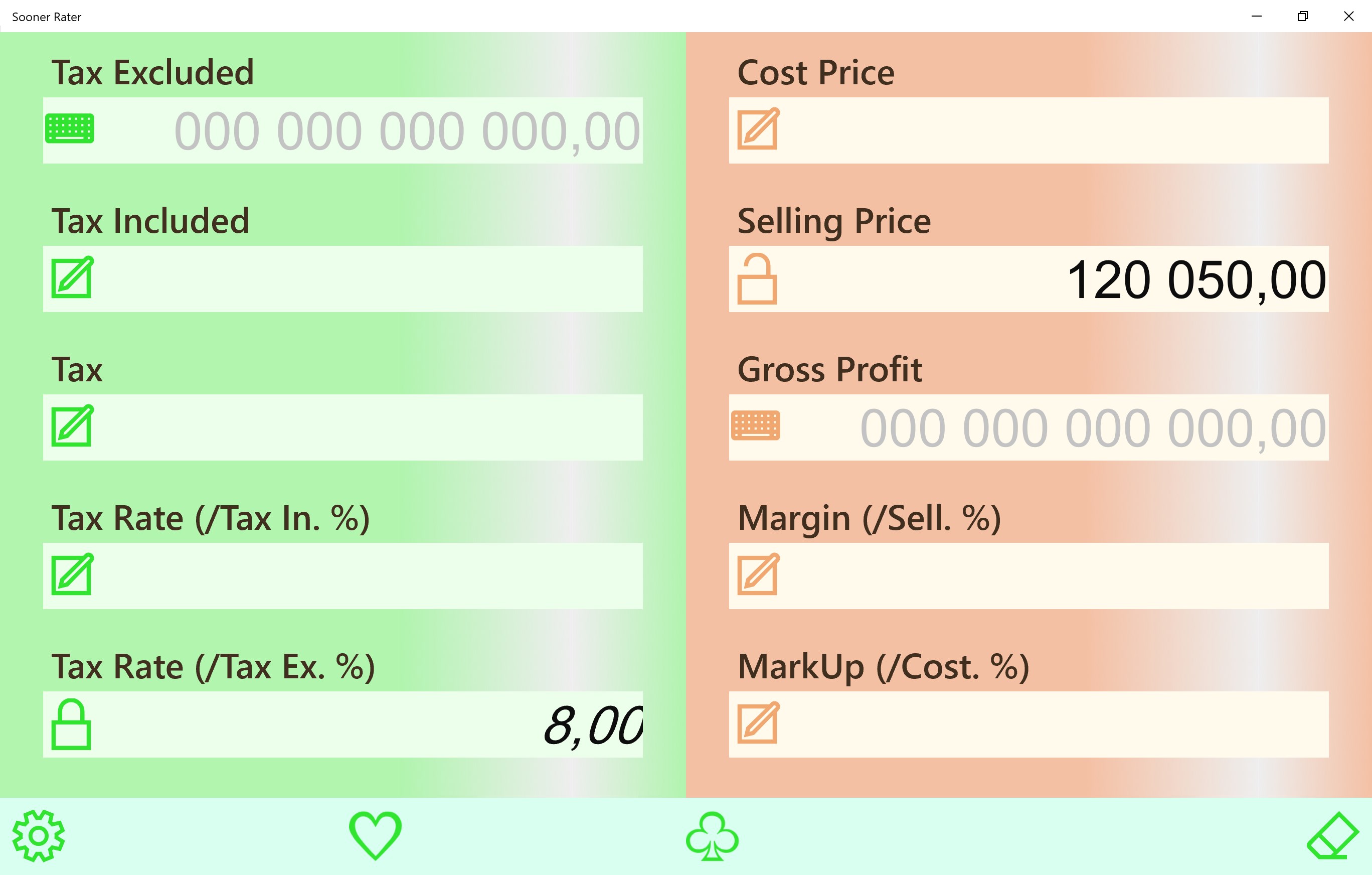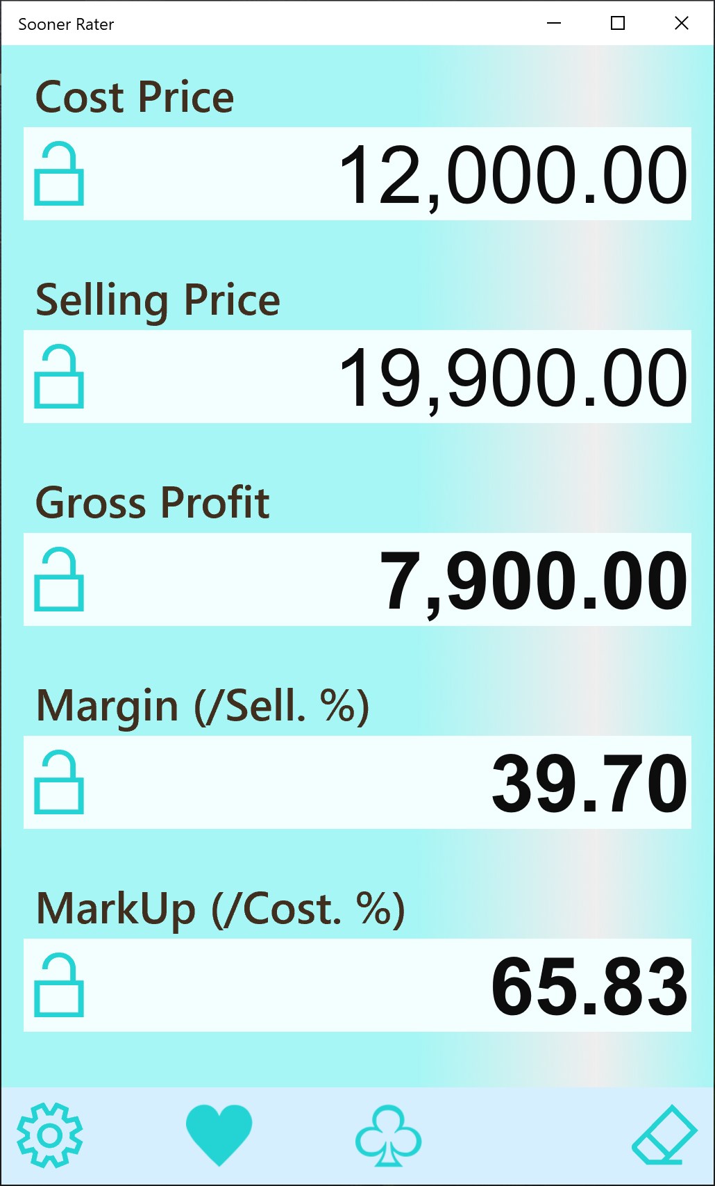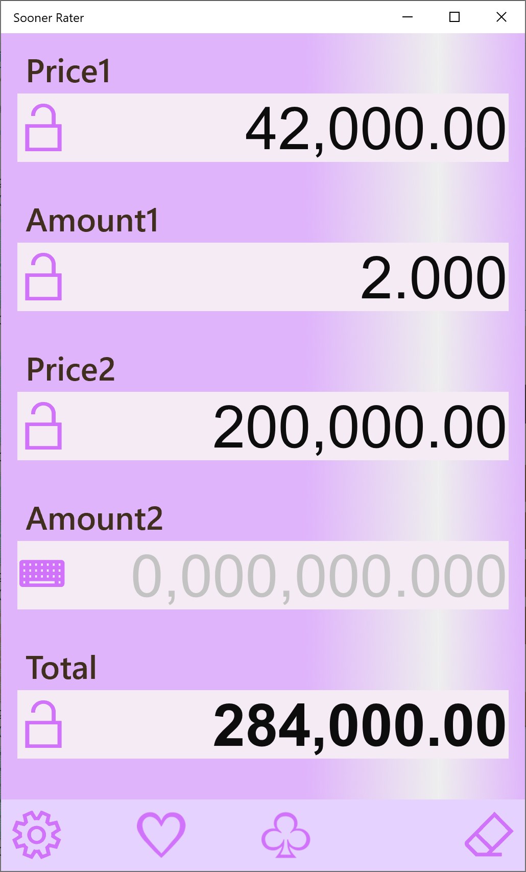 Percent calculation 4 sheets. Color-coded for your memorize help.Percent sheet labels are selectable from 5 types.Simple total sheet (2 items) is equipped as auxiliary.Number input and modification by direct touch action to the digit you want to change. In re-calculation of slight changes, entering full number is not necessary.Number input in keyboard sheet. And number input by hardware keyboard is possible.The direction of calculation is switchable by touch. No key order memorizes is not necessary.Calculation result is automatically done at the time necessary inputs reach.Lock of each number is possible.Internal calculation: 16-digit decimal or fraction, independently developed (Not binary floating/double)Display number length is selected from 10/14-digit depending on window size.2 sheets can be parallelly shown and operated when window size is larger.Copy / paste function of a each number and a sheet.2 memoriesConfigurable rounding location classified 3 kinds, money/rate/amount.Selectable decimal point/separator character(5) and separator position(4), and number character(19).Automatic save of the calculation state at the application termination.Whole initializing. Or returning to the state at the time application started.Dark mode