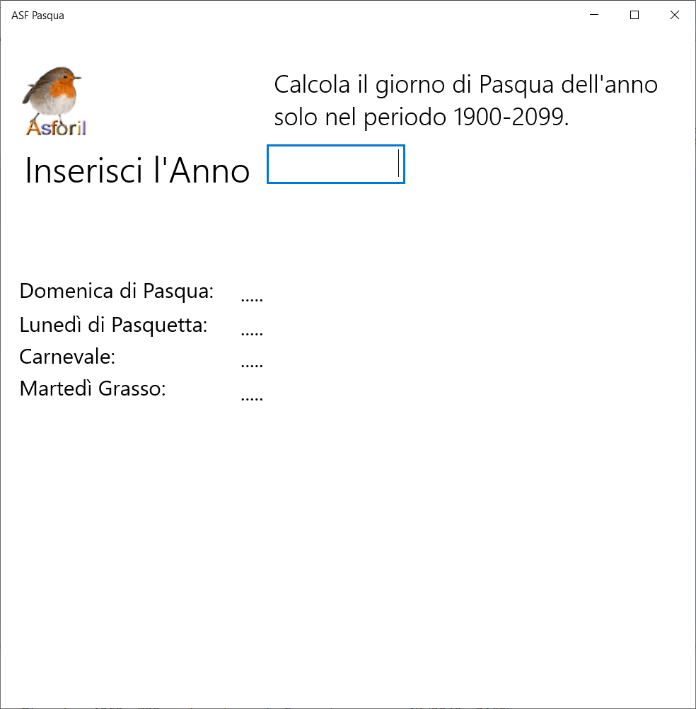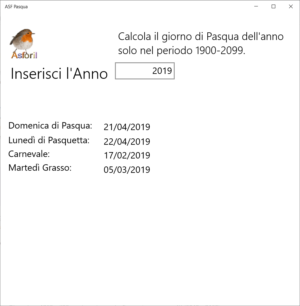 Prova di pubblicazione. Calcola il giorno di Pasqua dell'anno solo nel periodo 1900-2099.