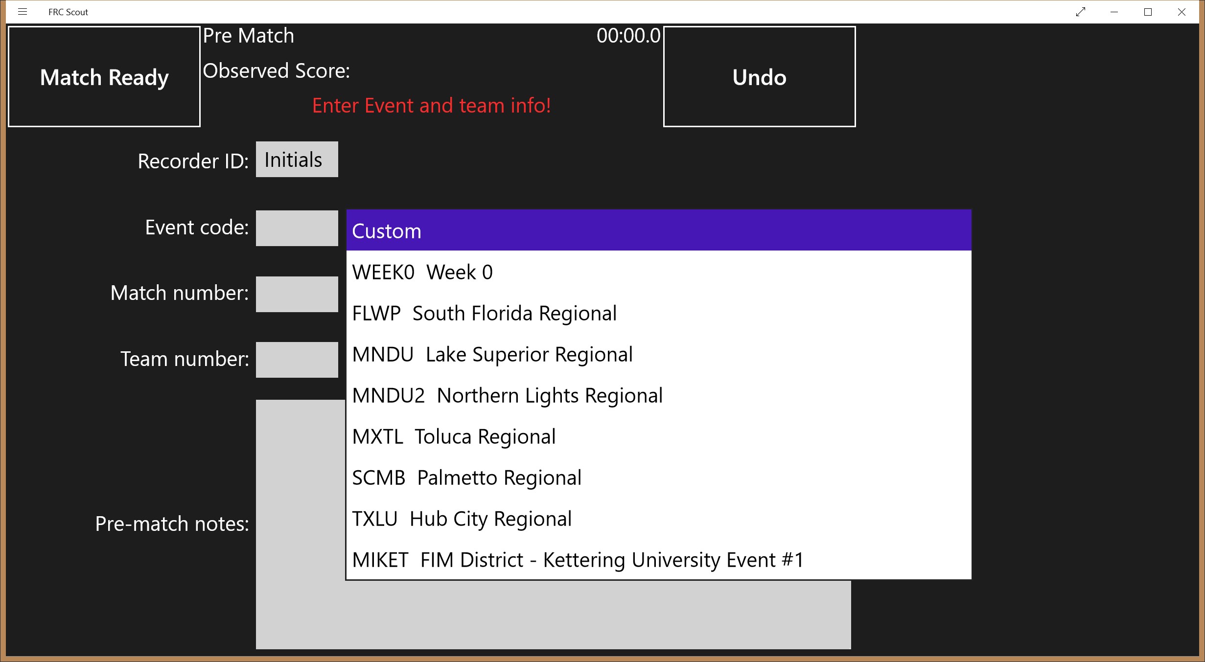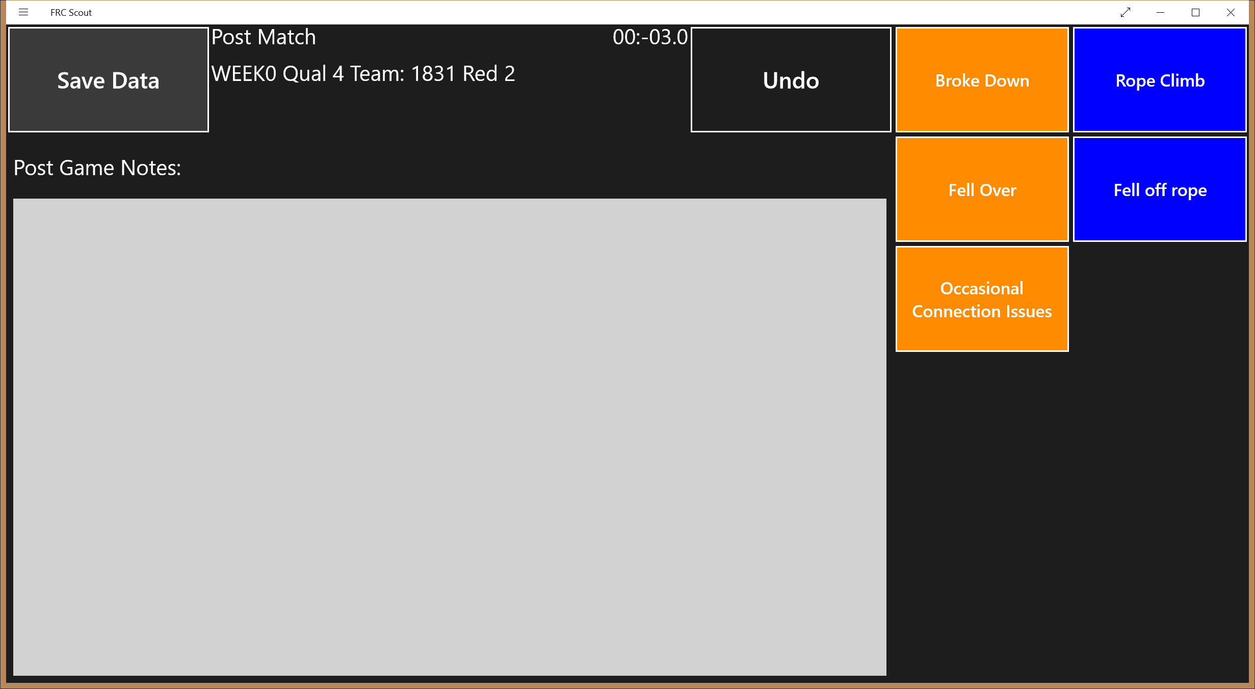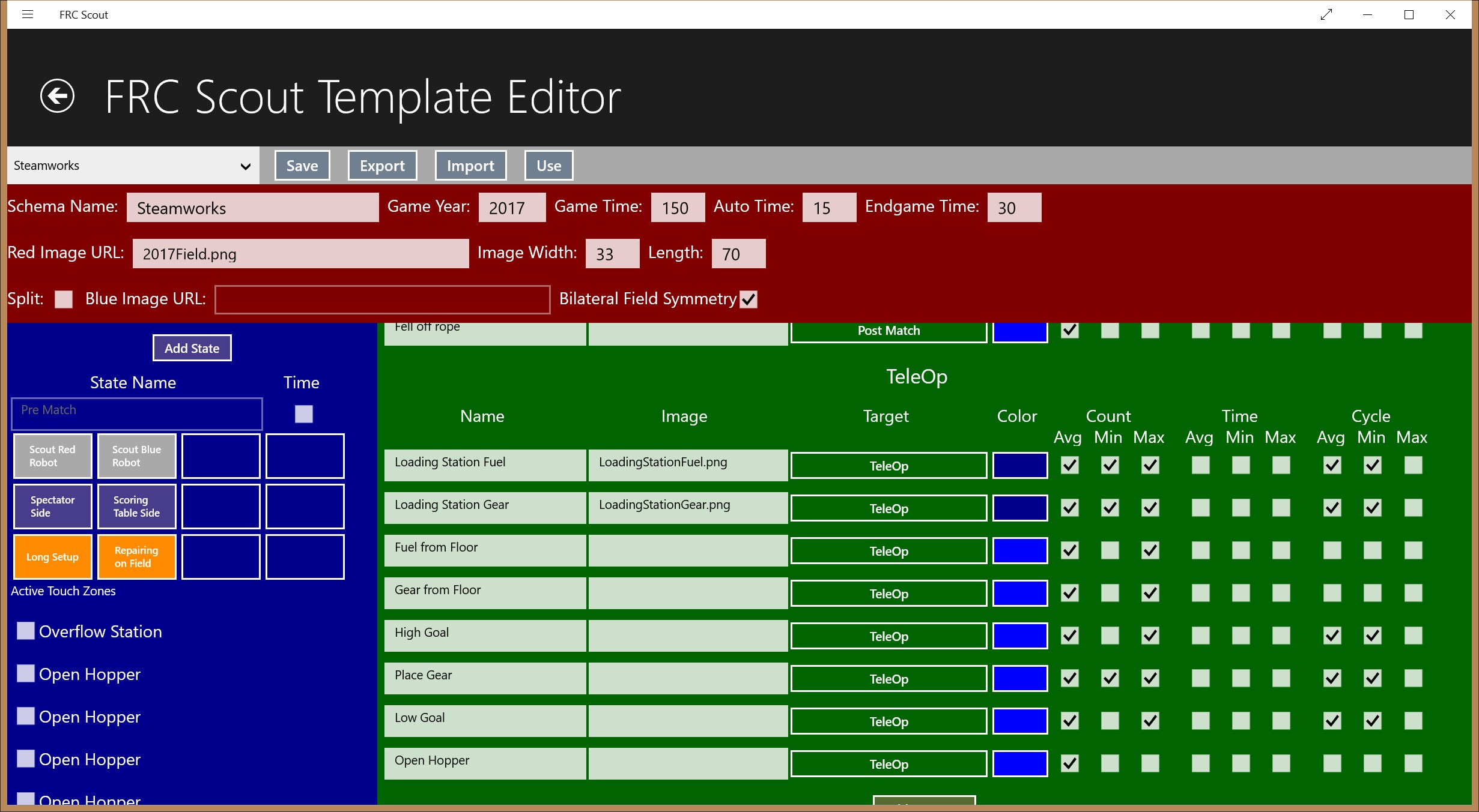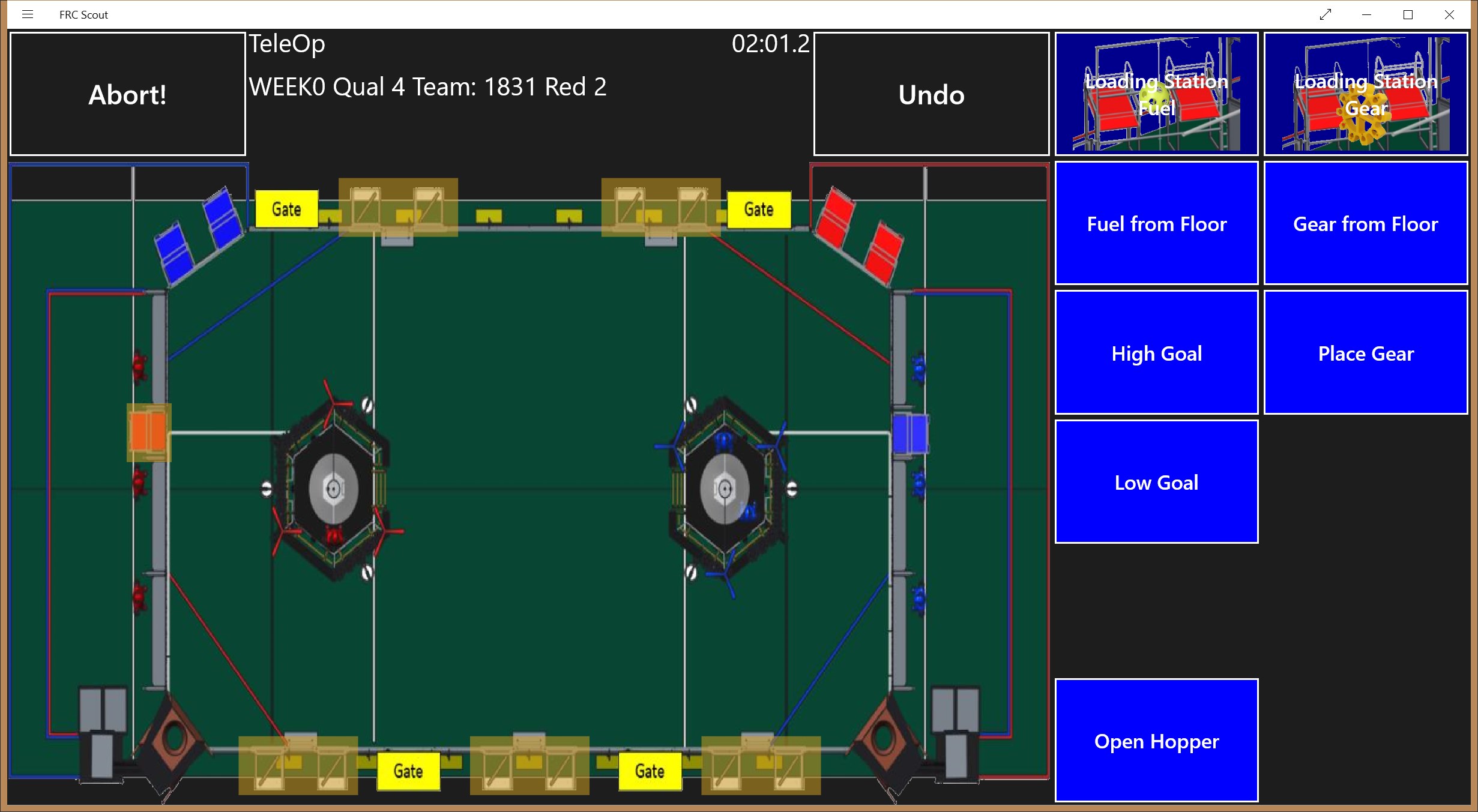 This is a generic scouting tool designed to be used live during a match to record the activity of a single robot during a match. This data can then be combined to produce reports that can show average, minimum, and maximum counts of items, timings of items and cycle times items. If internet connectivity is available, it will download the match list for an event so by specifying a station, the team number being monitored will be auto populated. The app comes pre-populated with scouting templates for Steamworks and Stronghold.