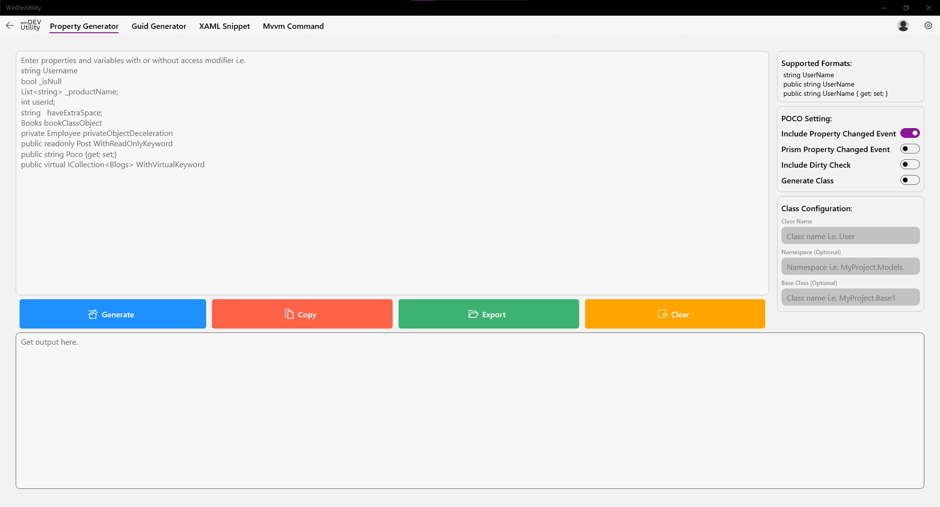 C# full property included property change events GeneratorMvvm Commands (RelayCommand, DelegateCommand, and AsyncCommand) GeneratorClass to Xaml GeneratorSequential GUID Generator Grid layout XAML Generator Find unused XAML ResourcesUnused XAMLJson to C# classJson to C Sharpe classJson to C# classes
