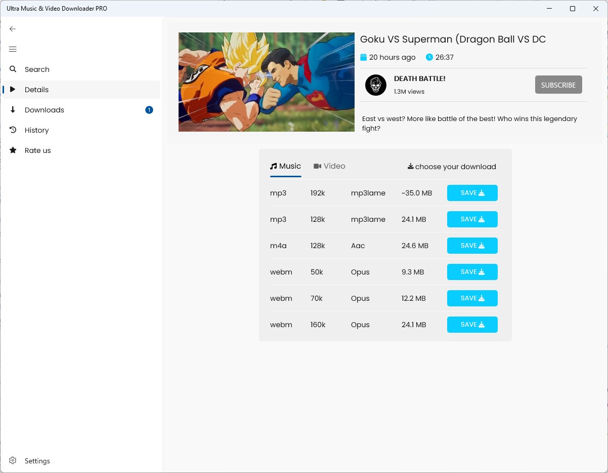 The free version of Ultra Music & Video Downloader PRO is quite generous, allowing music downloads with the only exception being mp3 at 192kbps and webm at 160kbps. In terms of video, the free version enables downloads excluding files of 720p and above, making it a great starting point for users.