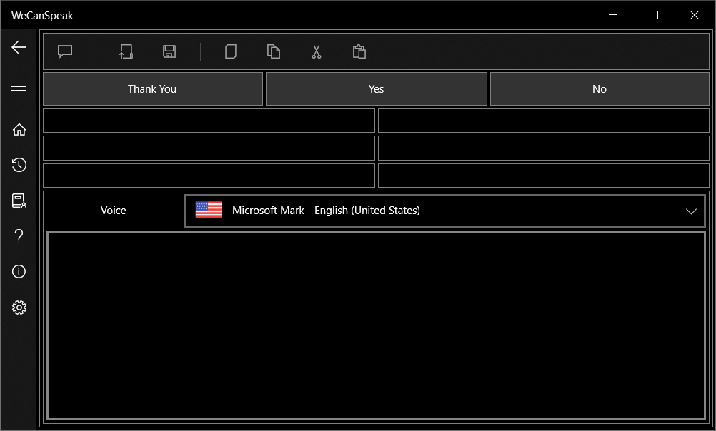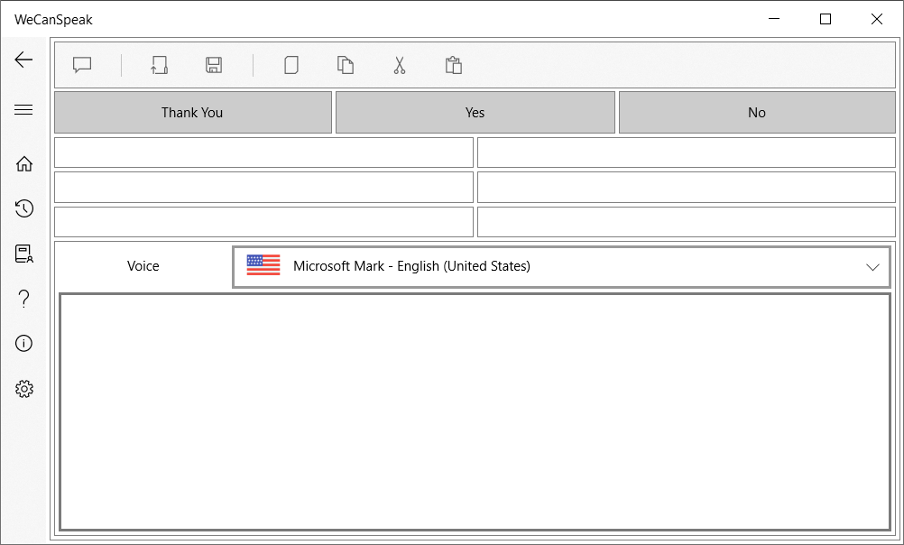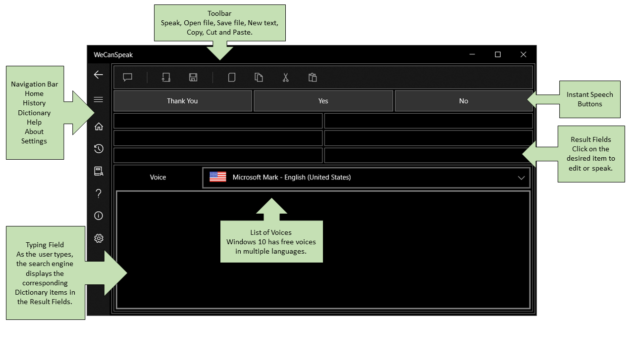 WeCanSpeak is a Text to Speech (TTS) application designed and developed exclusively to streamline the communication process. Made by those with special needs for those with special needs, it has some different features like: user-customized dictionary that allows not only the inclusion of words, but also complete sentences, advanced search engine, which gives complete freedom of typing for the user, with uppercase, lowercase, and with or without accents, conversation history, which makes it unnecessary to retype phrases ever typed before, and read and write text files, which allows the user to type long texts in your favorite editor, such as Microsoft Word for example.