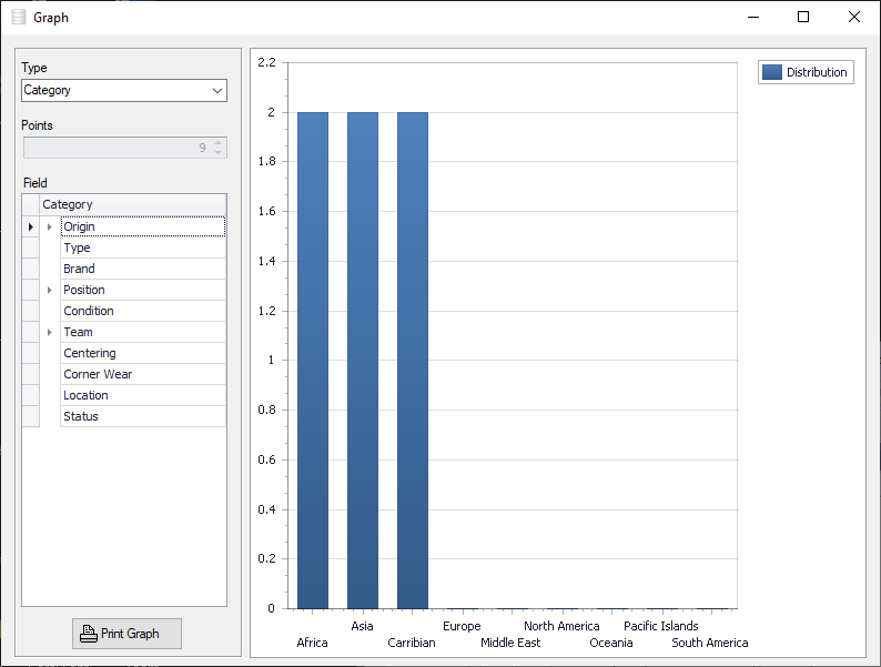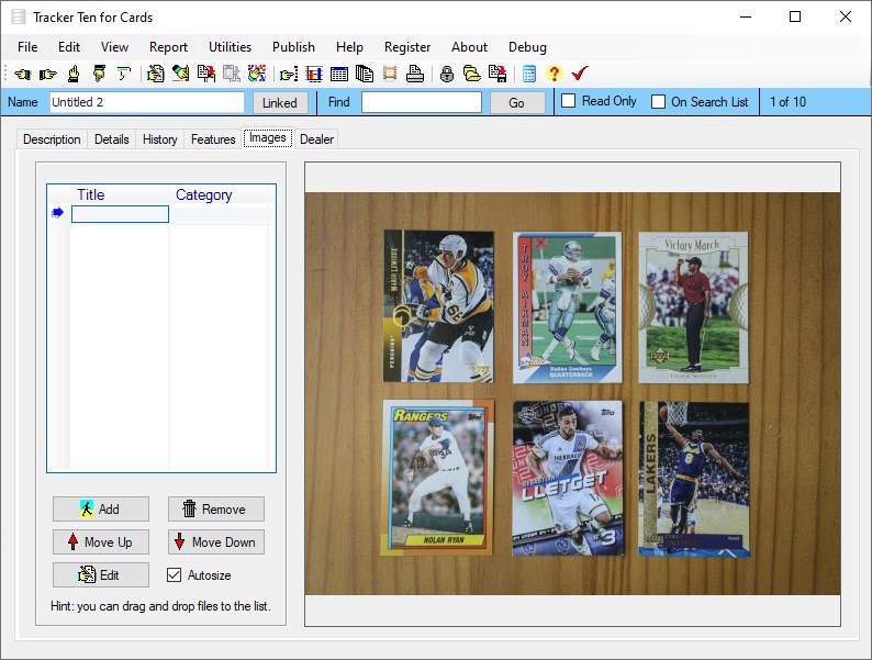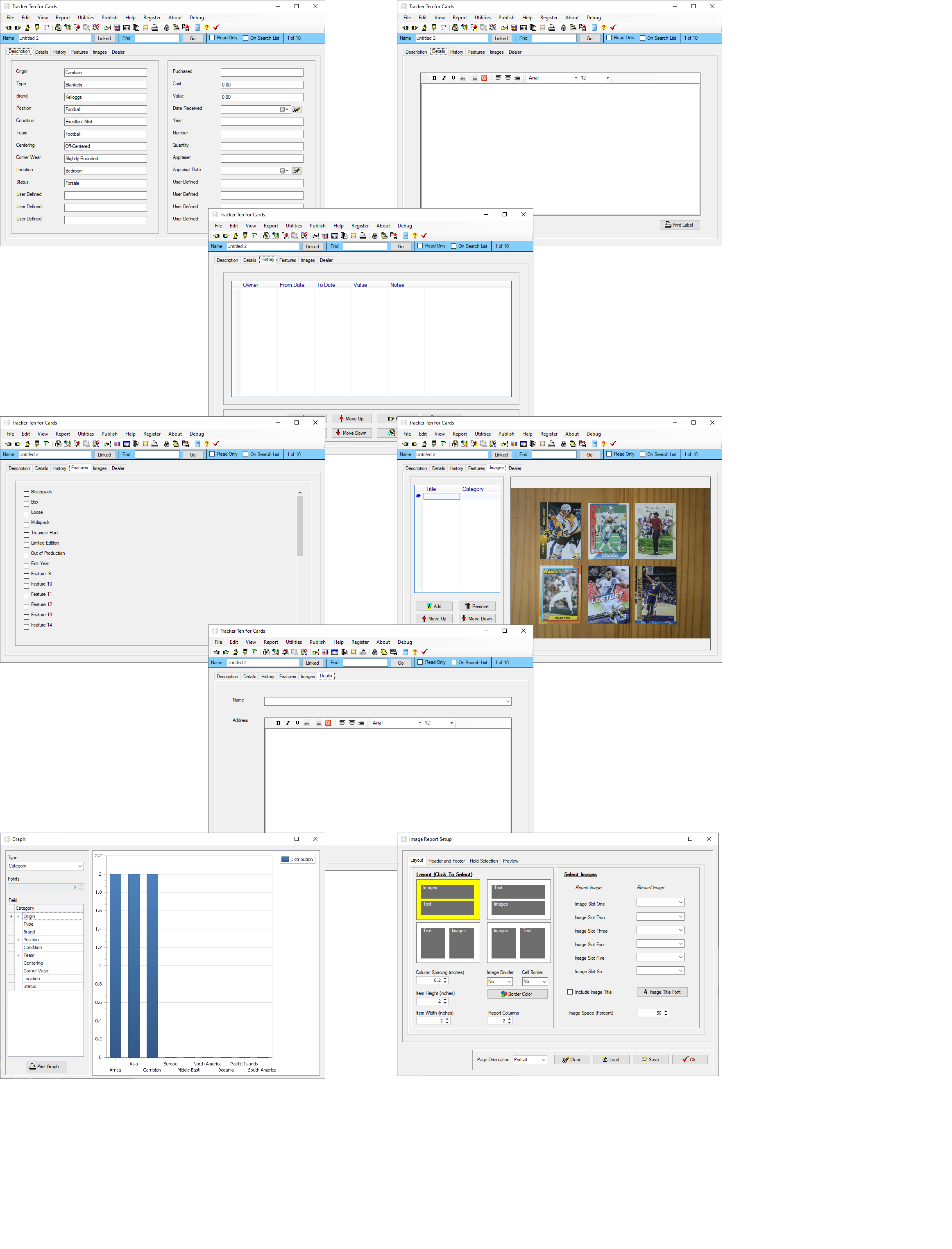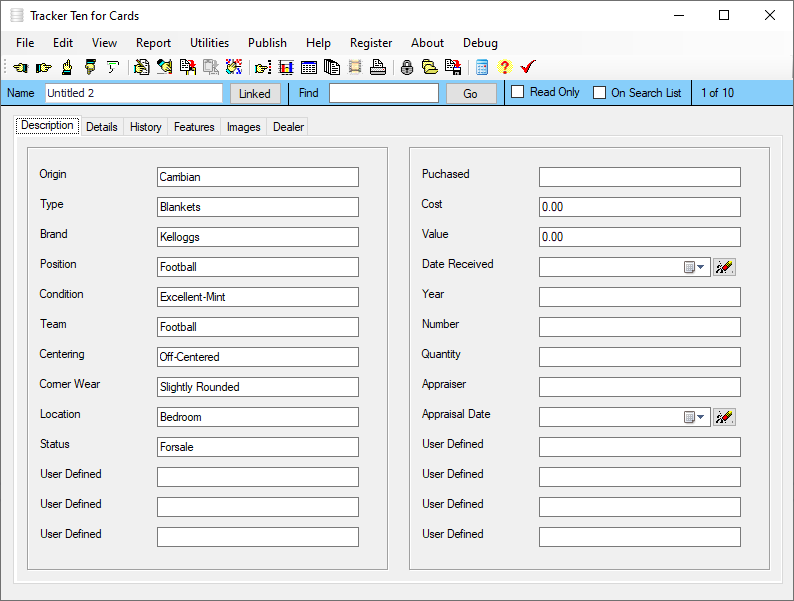 Sample fields include origin, type, brand, position, condition, team, centering, corner wear, location, status, puchased, cost, value, date received, year, number, quantity, appraiser and appraisal daVery easy to learn and use.Online help file.Numerous user defined fields so you can setup the software to suit your exact needs.Number and Date reports showing upcoming reminders.Rich text format notes areas for customer details and notes.30 Customizable feature tracking check boxes.Dealer name and contact information tracking area.Rich text format notes areas for each record.Advanced multi-level nested item categorization system.Quick and Easy Data Entry with Customizable Pull Down Menus.Powerful Data Sorting and Filtering.Simple and easy cut, copy, insert and record navigation functions.Multiple Image Support (up to 100 pictures for each record !). All major image types are supported (i.e. bmp, jpg, gif, png etc.). Easily incorporate pictures from your Digital Camera or Scanner.Also attach and view PDF equipment manual files in Image area.Full color image reports.Powerful and Intuitive Search Functions that let you quickly and easily retrieve the data you need Comma delimited data import.Multiple Data Views Including Spreadsheet, Album View (allowing you to visually view different items in your inventory side by side) and 3-dimensional full color Graphs showing inventory breakdown.Data export features allowing you to transfer data to spreadsheets or other software programs.
