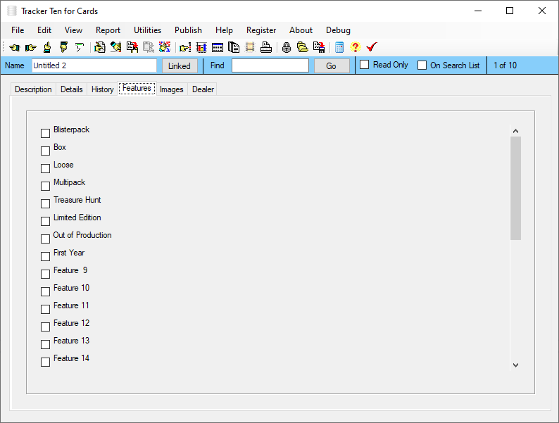 Tracker Ten for Cards is a full-featured database system that tracks your trading card collection. Although the software has been designed for baseball, football, basketball and hockey cards, it can be easily customized to suit any type of trading card collection. The software is great for insurance record keeping or simply to get organized. The software features advanced reporting, graph generation, item history tracking, customizable data fields, rich text format notes, data export, a powerful search engine, cost and value tracking (based on values you enter yourself), optional web publishing and more. The software can also generate full color reports, incorporating images; great for accurate insurance record keeping and automatic catalog generation. The software is ideal for both business and personal use.