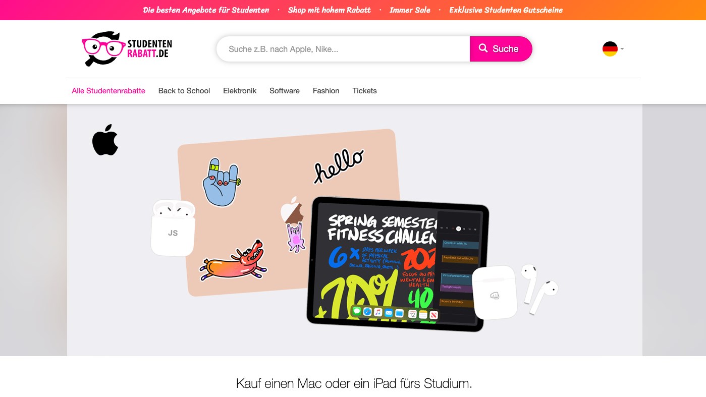 Kluge Studierende nutzen die Studentrabatt-app. Wir sammeln und erstellen Studentenrabatte und Studentenprivilegien für dich. Wir versuchen, es dir so einfach wie möglich zu machen. Über unsere Website kannst du schnell und unkompliziert interessante Angebote, Gutscheine und die besten Online-Deals finden und so schnell eine Menge Geld sparen!