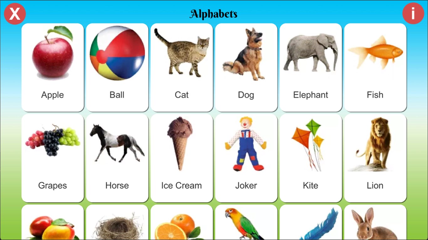 Kids can learn alphabets, numbers, body parts, shapes, and birds’ pictures. All the pictures are beautiful and with English spelling. Kids can listen the word by clicking on it and it pronounce the word in English.