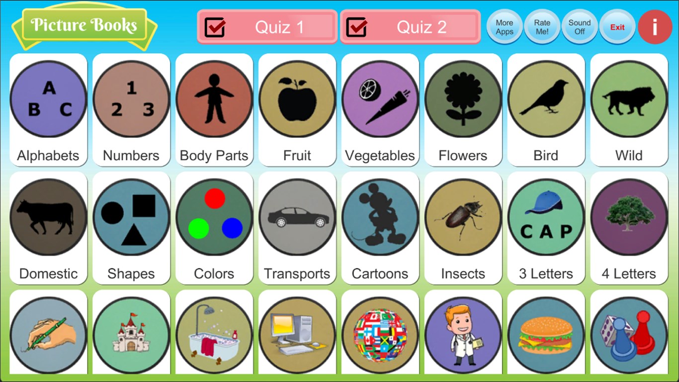 1200 Pictures in 36 books.Two types of quiz with guess the picture and words.Picture Book is for toddler to learn spelling as well as pronouncing words.Quiz 1: Guess the picture from 12 pictures.Quiz 2: Guess the correct word from 8 words.