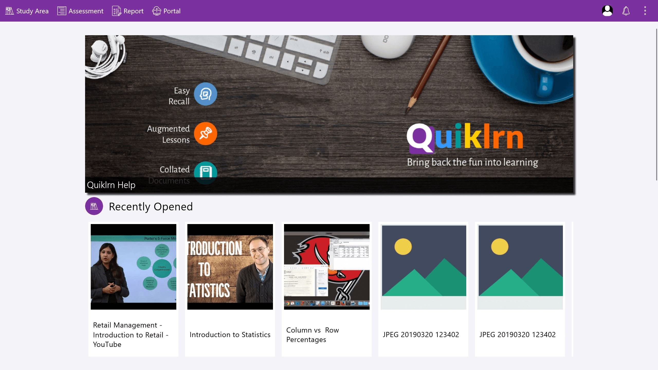 Study Area is the work space where you can add learning resources from Quiklrn store, email, messaging apps, files and gallery. Organize your learning materials according to courses as subjects. Contents are also can be tagged using keywords or phrases for quick search.