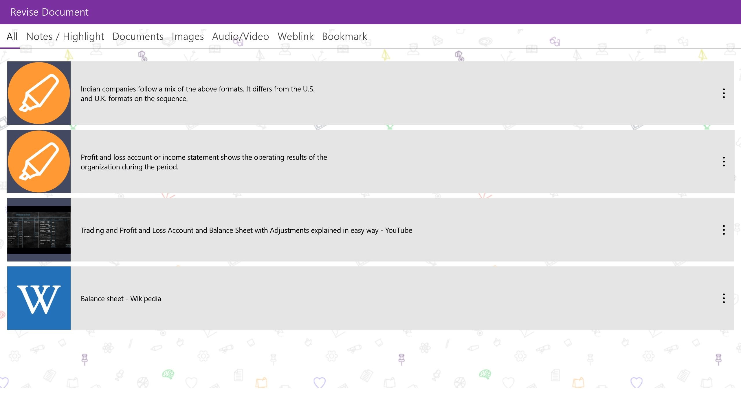 Simply highlight important points on any page. Create a note on any document be it text, video/audio or images and named bookmarks. Use Quiklrn Reader to pin video, audio or image files from the file manager, images from the picture gallery or using camera, documents from the study area and relevant web links. These pins can be placed adjacent to the learning context.