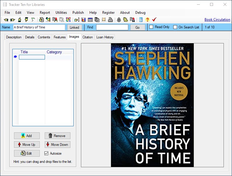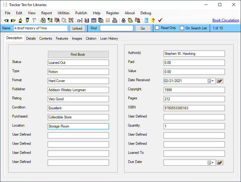Sample fields include find book, status, type, format, publisher, rating, condition, purchased, location, author(s), paid, value, date received, copyright, pages, ISBN, quantity, loaned to & due date.Very easy to learn and use.Numerous user defined fields so you can setup the software to suit your exact needs.Online help file.Keep track of book loans and circulationAutomatically look up book information using ISBNRich text format notes areas for customer details and notes.30 Customizable feature tracking check boxes.Supplier name and contact information tracking area.Powerful Data Sorting and Filtering.Quick and Easy Data Entry with Customizable Pull Down Menus.Advanced multi-level nested item categorization system.Simple and easy cut, copy, insert and record navigation functions.Multiple Image Support (up to 100 pictures for each record !). All major image types are supported (i.e. bmp, jpg, gif, png etc.).Easily incorporate pictures from your Digital Camera or ScannerFull color image reports.Powerful and Intuitive Search Function that let you quickly and easily retrieve the data you need.Comma delimited data importData export features allowing you to transfer data to spreadsheets or other software programs.Multiple Data Views Including Spreadsheet, Album View (allowing you to visually view different items in your inventory side by side)