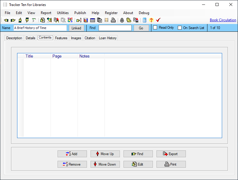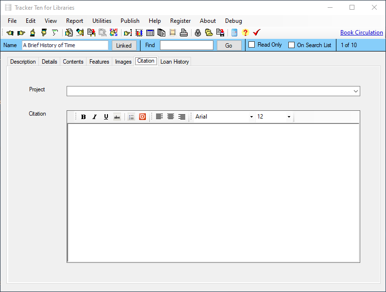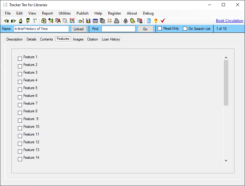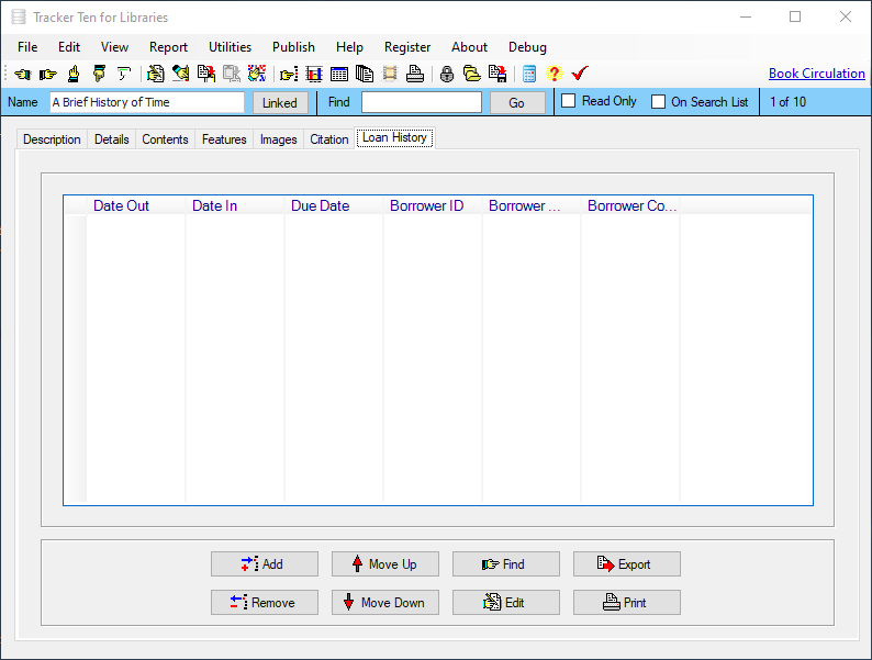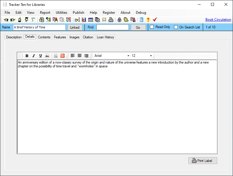 Tracker Ten for Libraries is a full-featured database system designed for small libraries. You can use the software to keep track of all types of books, magazines, videos, CDs and other media. For each item you can track title, author, subject, publisher, copyright year, date received, cost, image, value, minimum desired quantity, current quantity, ISBN, supplier, location, notes and much more. You can also record a loan history for each item, and you can generate reports showing you which items are overdue. The software also supports most barcode readers and can automatically generate and print barcodes. In addition, you can also use your barcode reader to easily jump to items in your database. The software features advanced reporting, graph generation, data export, a powerful search engine, full customization, optional web publishing and more.