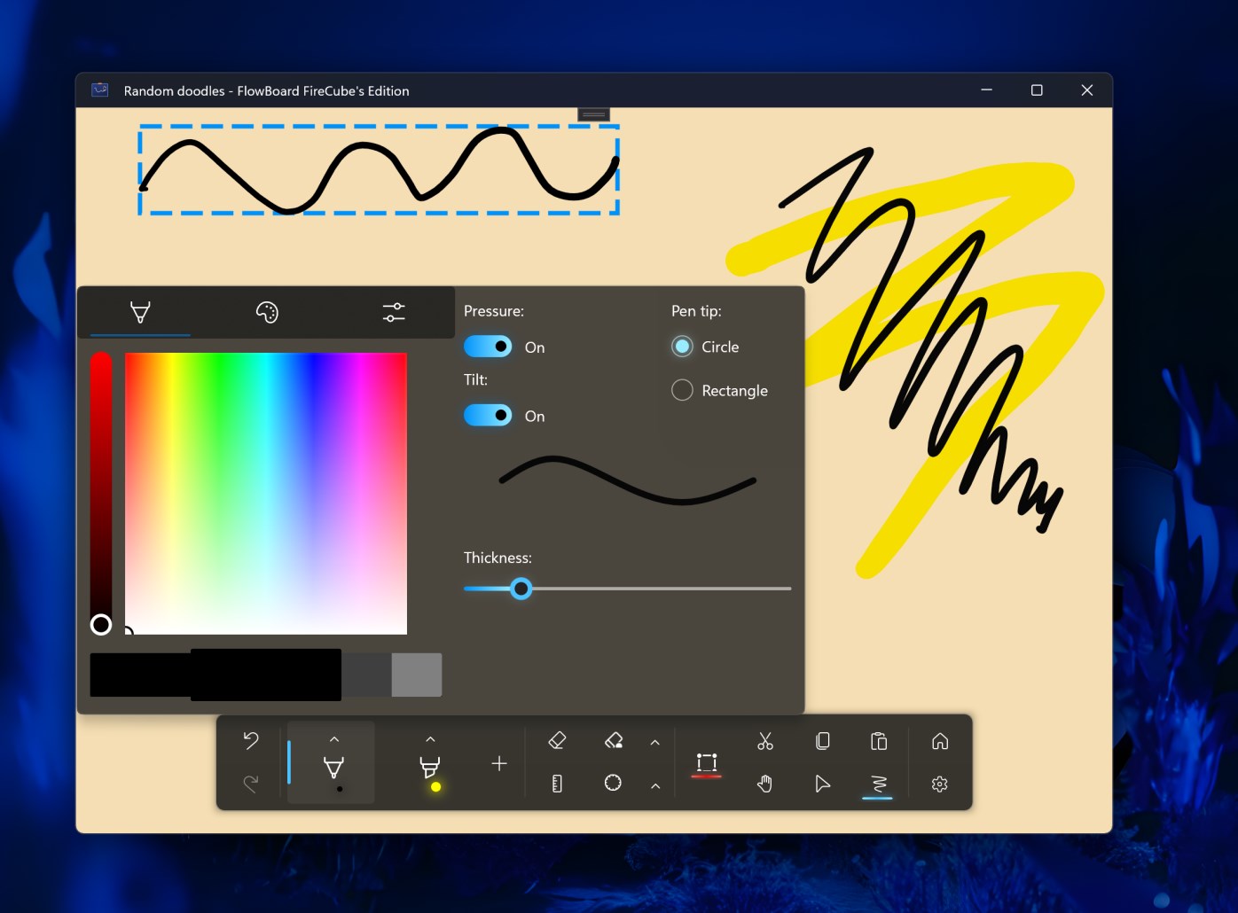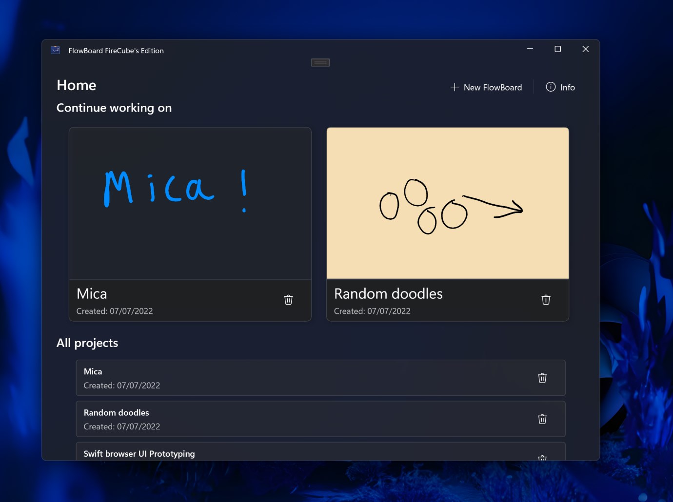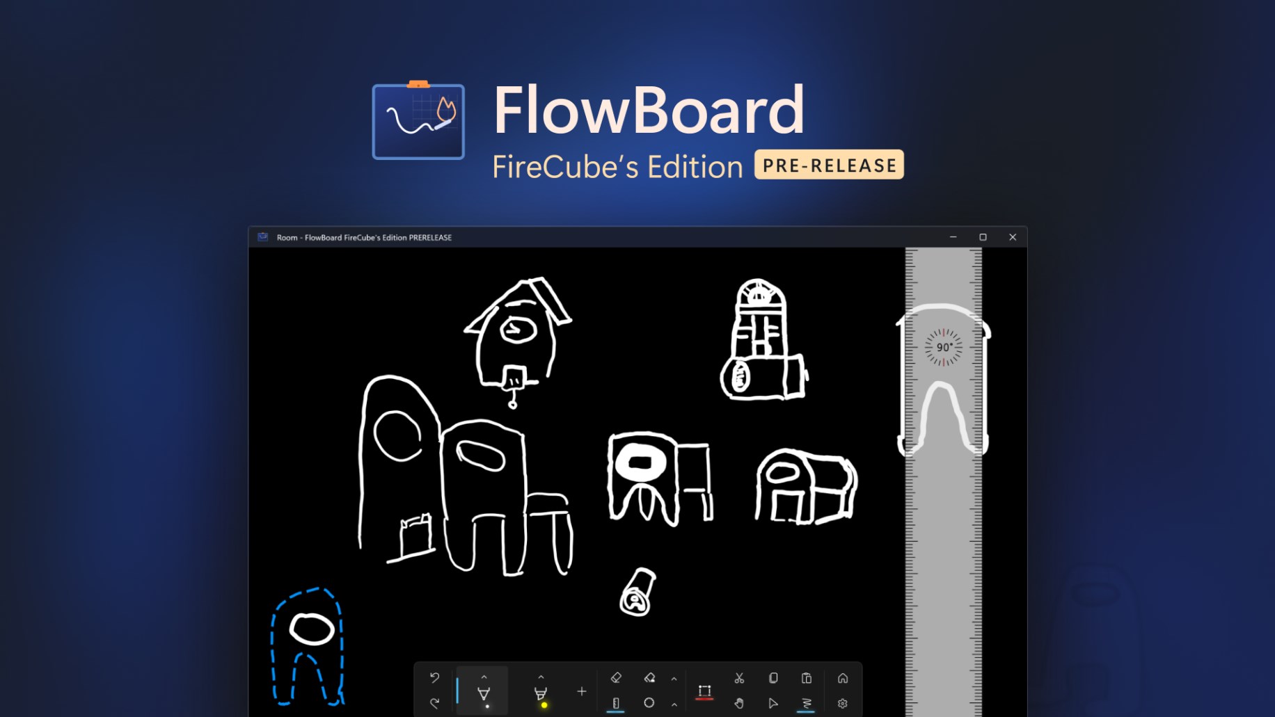 FlowBoard - FireCube's Edition is a modern open-source Whiteboard application with an infinite zoomable canvas that supports customizable backgrounds including Mica. The toolbar contains selection tools, portion & stroke eraser, ruler & protractor and more. An unlimited number of projects can be saved in app.