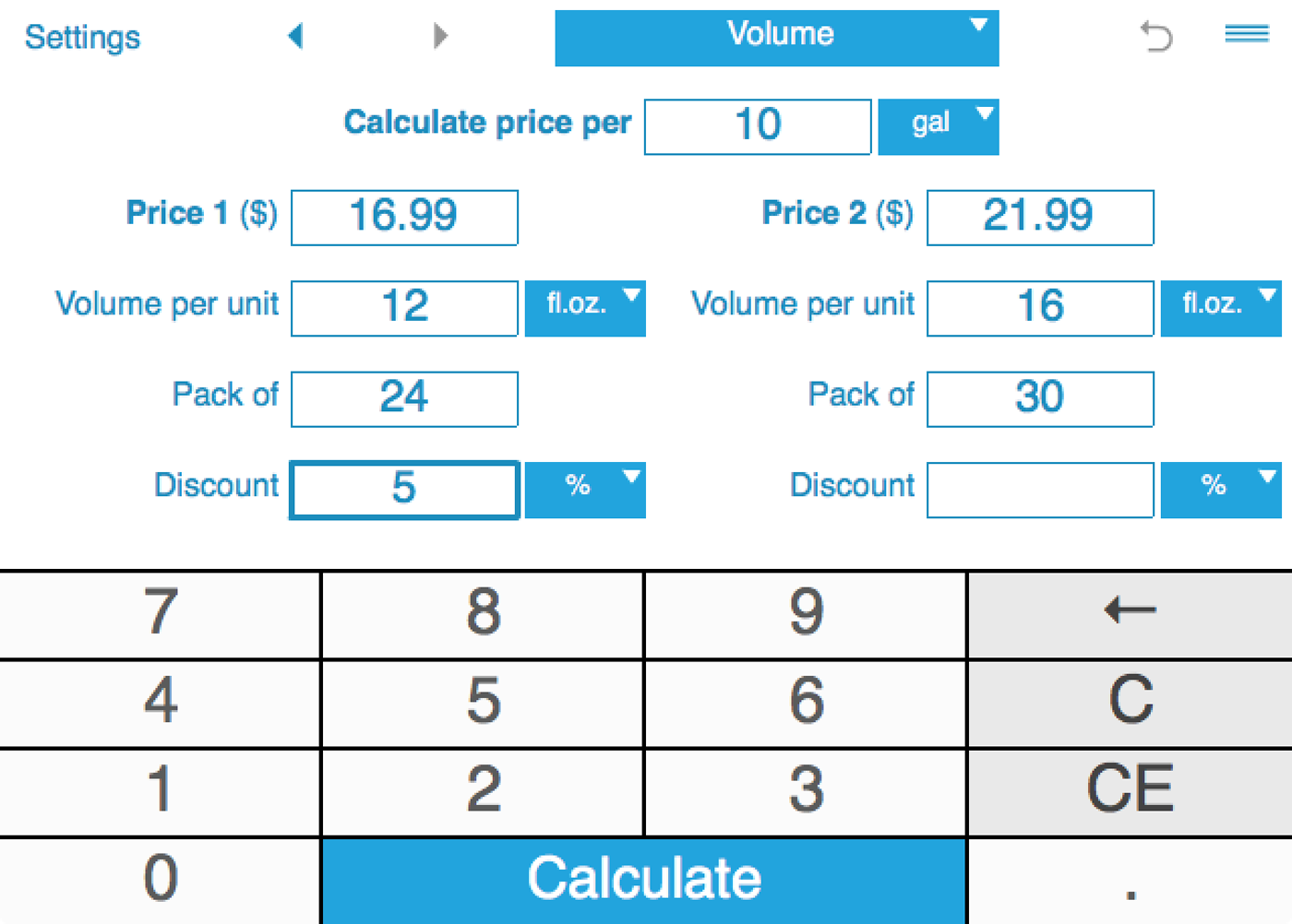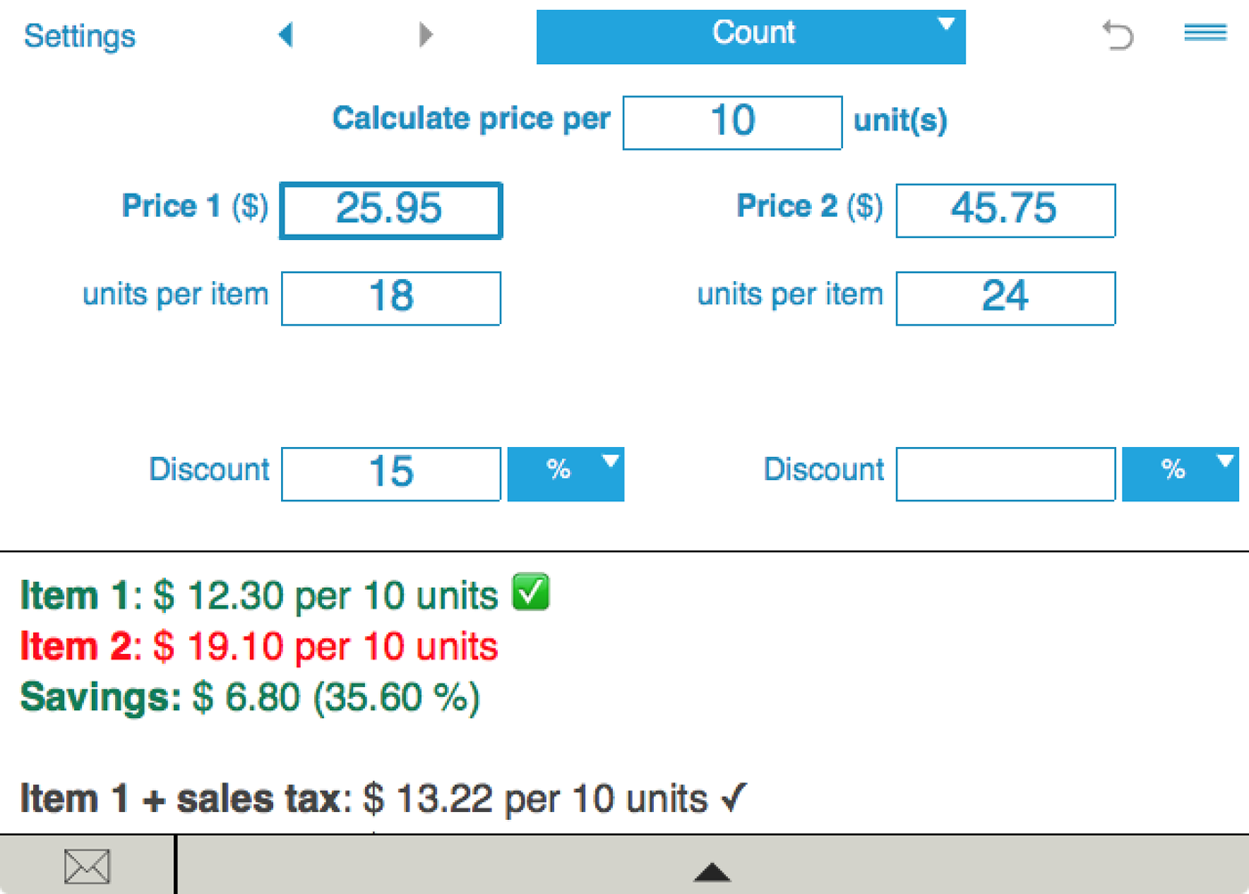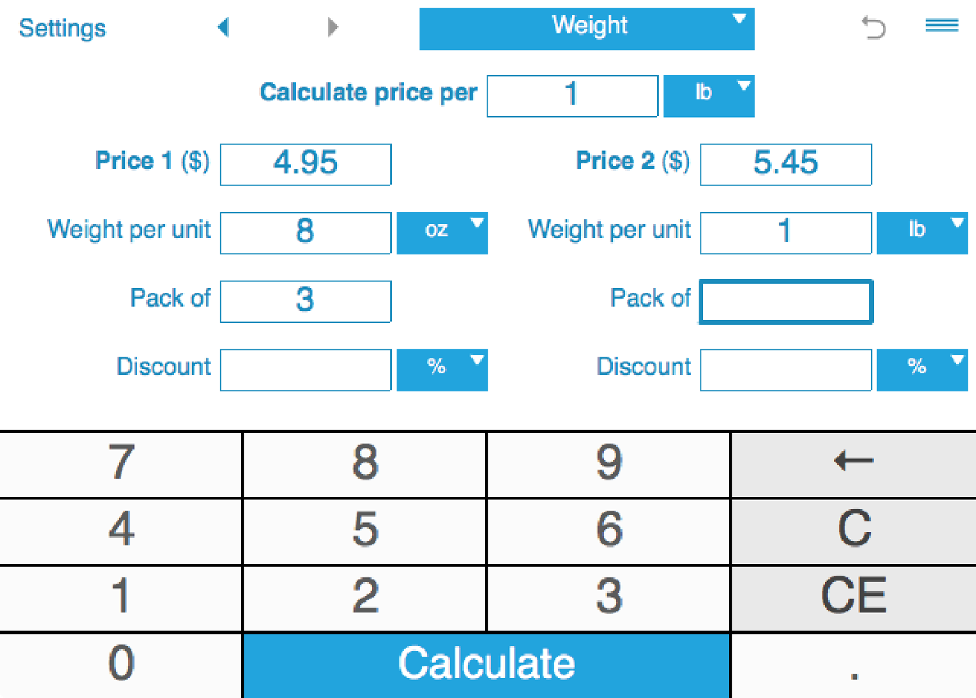 Unit price calculator allows you to compare sale prices with or without discounts. You can enter discount percentage or discount amount. Note: to enter discounts, you need to rotate your device to landscape orientation.