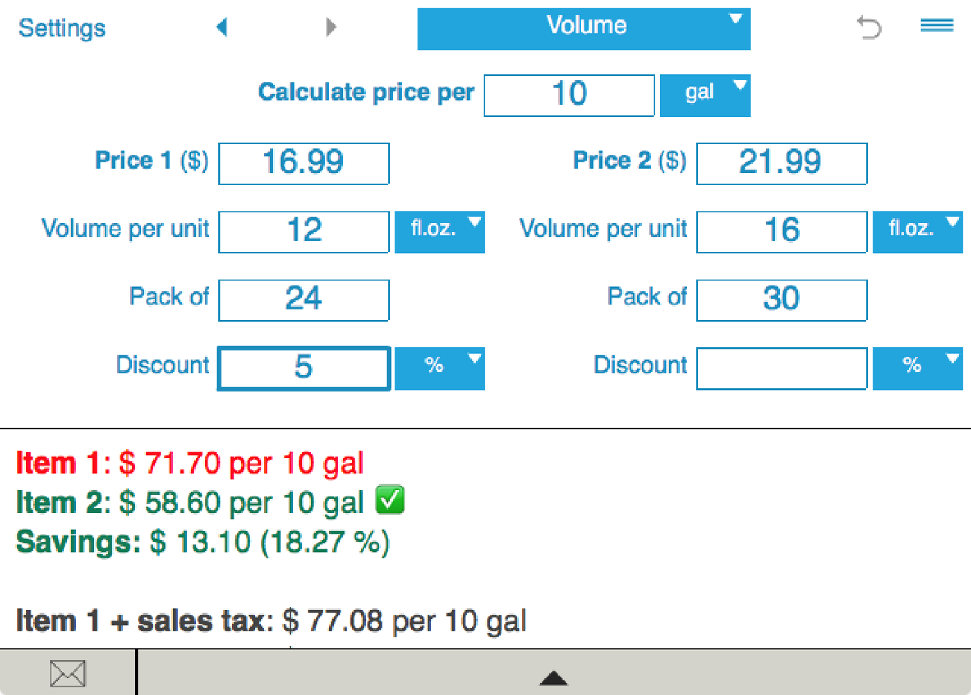 Simply enter the prices, quantities and sizes for comparable products and tap Calculate. To calculate the price with the Sales Tax, just set it in the Settings window. Unit Price Calculator shows you the better deal and your savings.
